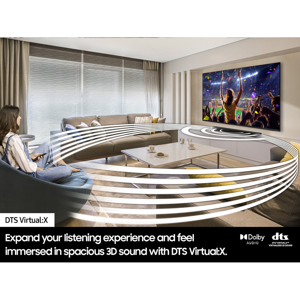 Experience spacious 3D sound with the HW-C450 2.1-Channel DTS Virtual:X Soundbar System from Samsung. The soundbar is equipped with Dolby Digital and DTS Virtual:X to allow you to experience 3D sound effects, while the included wireless subwoofer delivers bass you can boost with a tap on the remote. Samsung's Adaptive Sound Lite makes voices come through clearly, and Game Mode optimizes gaming with synced directional audio. Conveniently control the soundbar and your Samsung TV with the included remote control. Additionally, you can connect the system to any compatible Bluetooth device, such as a smartphone or smart TV, for wireless audio playback.