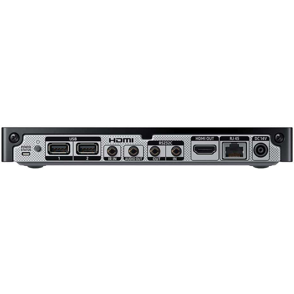 The UHD Signage Player Box from Samsung employs Samsung's SMART Signage Platform chip, which combines PC and media player functions to provide an all-in-one solution with a powerful quad-core CPU for faster processing and user-friendly content management. The digital photo, video, and audio player supports FAT32 and NTFS file systems and can play up to three Full HD video files simultaneously or one UHD file at a time with support for virtually every file extension. PowerPoint, PDF, and Microsoft Word documents are easily displayed on any compatible display via the unit's HDMI 2.0 output. Additionally, there are two USB-A 2.0 ports, an audio line out, an infrared port, an RJ45 LAN port, and an input and output for RS-232 device control.
