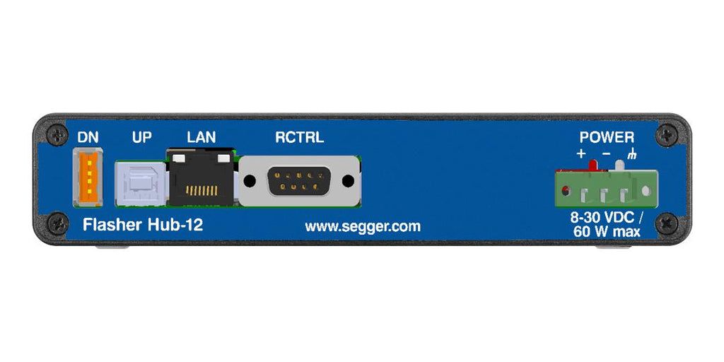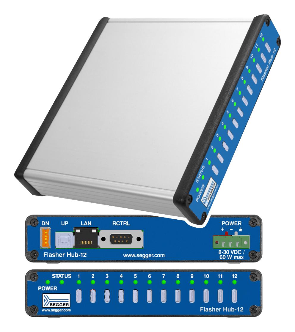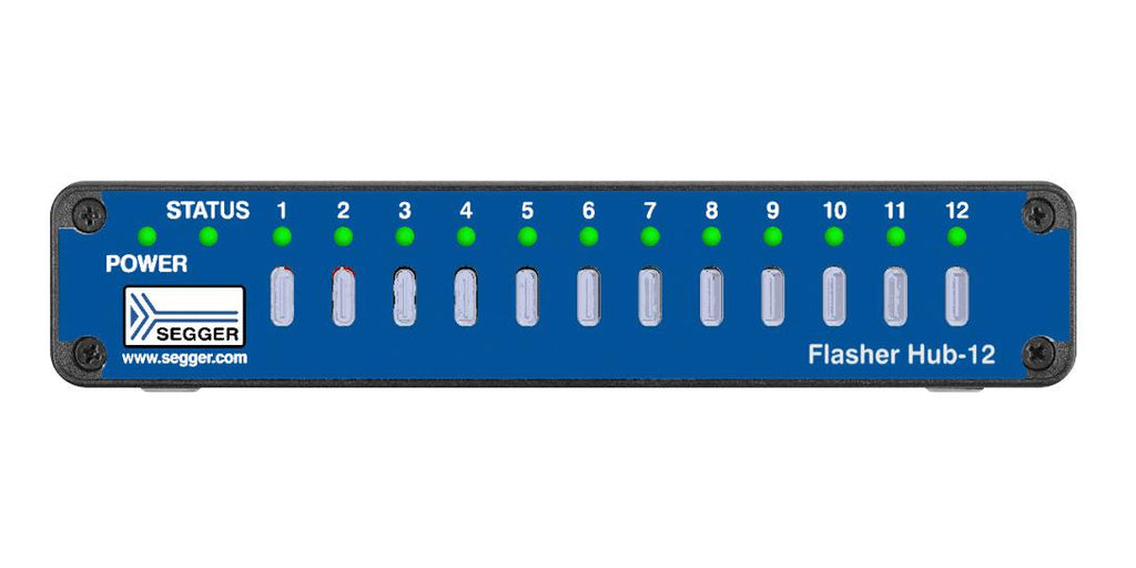 5.01.20 is a flasher hub-12 that controls up to 12 flasher compact units serving as individual channels for parallel, high-speed gang programming. Each channel can be configured to program a different device or a different firmware image. The flasher hub-12 is set up just once per channel using SEGGER's flasher software package. The software depends on the type of flash chip being programmed. The Hub can receive commands and send results "stand-alone" via TELNET, a desktop PC is not required for control. The combination of a single flasher Hub-12 and up to 12 flasher compacts is the perfect solution for high-volume multi-panel and multi-target mass production.