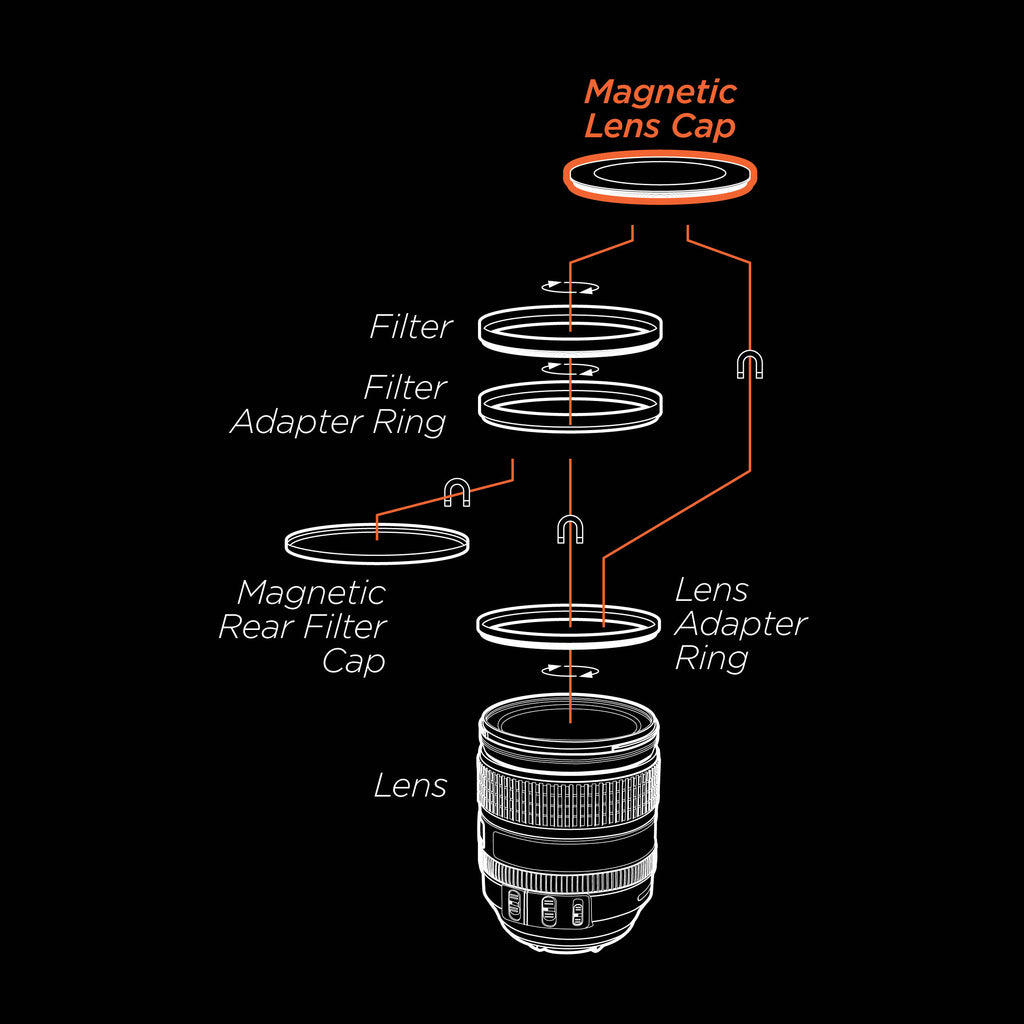This 77mm Magnetic Lens Cap is part of the Sensi Pro Magnetic Filter System, and easily attaches to lens using the 77mm Magnetic Lens Adapter Ring. The magnet is strong and will hold even with a few bumps, eliminating the need for screw-on or pinch-button caps. Just quickly attach the magnetic cap, then safely walk around or put the camera in a camera bag with protected glass. Alternatively, when using a filter with the Magnetic Filter System, the cap can be screwed onto the front of the filter with the provided threading.