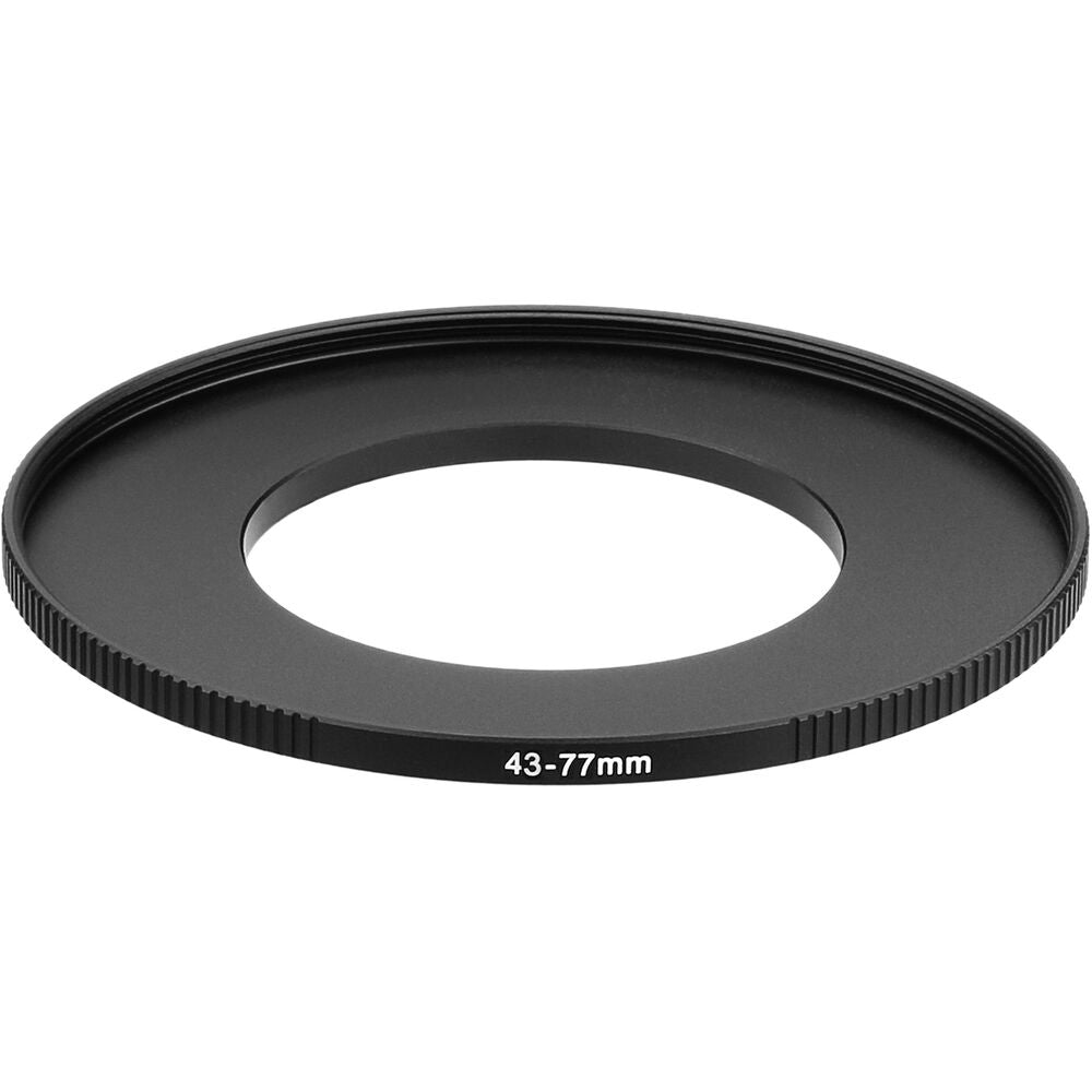 The Sensei PRO 43-77mm Aluminum Step-Up Ring permits the use of 77mm threaded filters on lenses with 43mm filter threads. It has large side knurls to provide a more textured grip when mounting or removing it from a lens. This step-up ring features a lightweight aluminum alloy construction that has a corrosion-resistant, matte black, hard-anodized finish for durability and to minimize reflections.