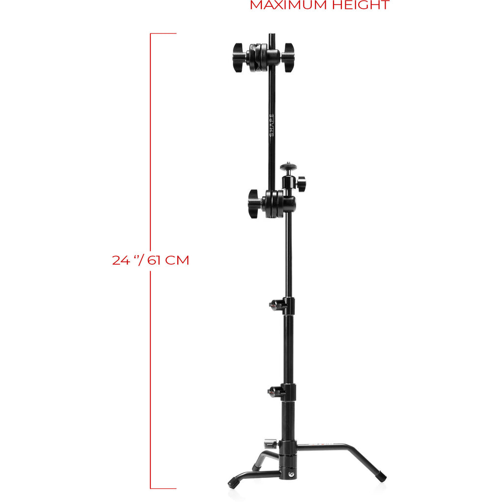 The Mini C-Stand with Ball Head from SHAPE is a compact stainless steel stand that holds dots and can be used for tabletop/miniature applications. It features two grip heads with 3/16" holes, a sliding top leg, and a ball head with a 1/4"-20 screw. It also comes with an adjustable smartphone bracket with two 1/4"-20 threaded holes that can secure your device while recording.