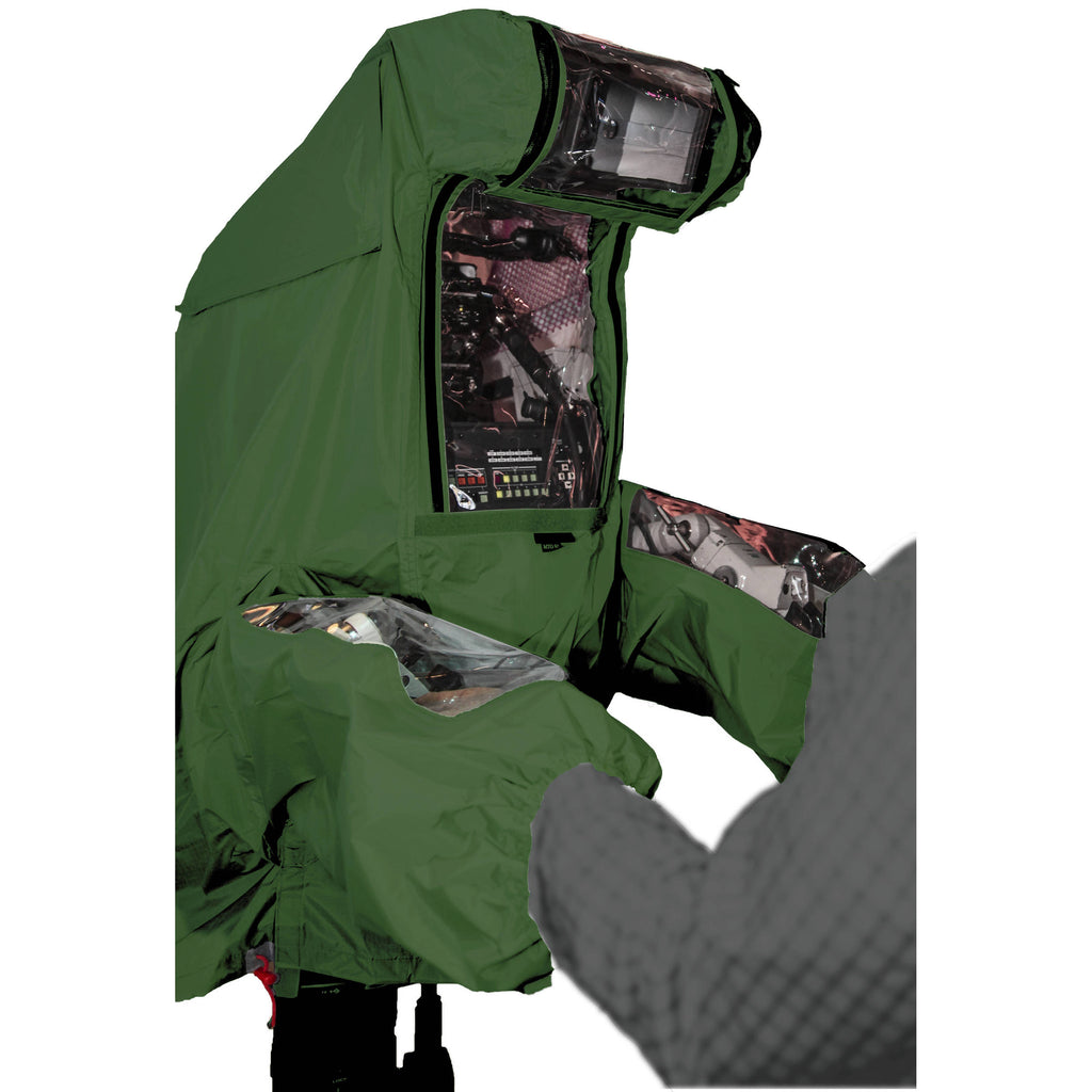 The MTO-S5-GR Camera Raincover �in�hunter green�from ShooterSlicker is a protective jacket for your long lens studio camera with 7 - 9" monitor. Long enough to cover the tripod head, it won't interfere with the movement of the fluidhead or tripod once installed, and windowed sleeves allow you to see the hand controls. The cover has vents for humidity control and air circulation, and the rear of the cover is designed with a clear plastic window�that opens for total view and access�to the LCD monitor. Ties on the middle and bottom of the cover allow you to fasten it securely to the tripod. The S5 cover is made from waterproof ripstop fabric with a urethane coating. The storage bag is sewn to the bottom of the cover so you can't misplace it.