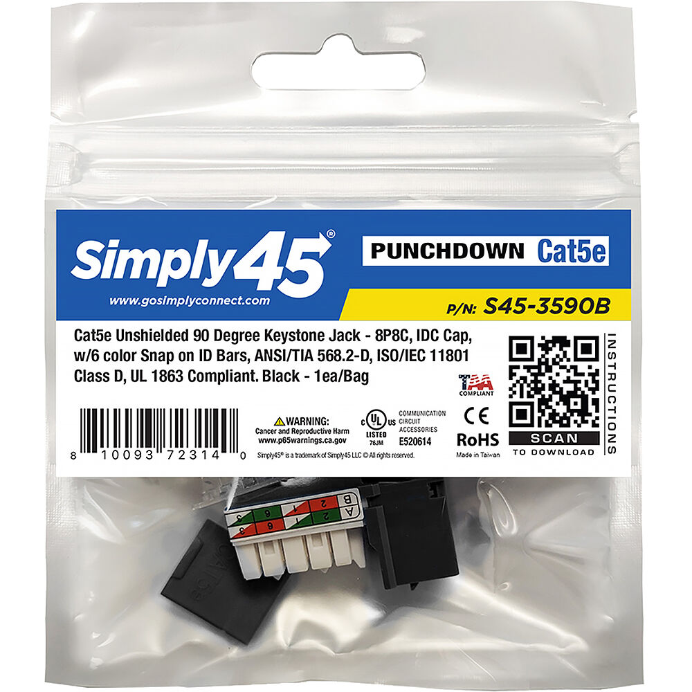 - Simply45 Cat 5e 90° Unshielded Keystone Jack (Black)