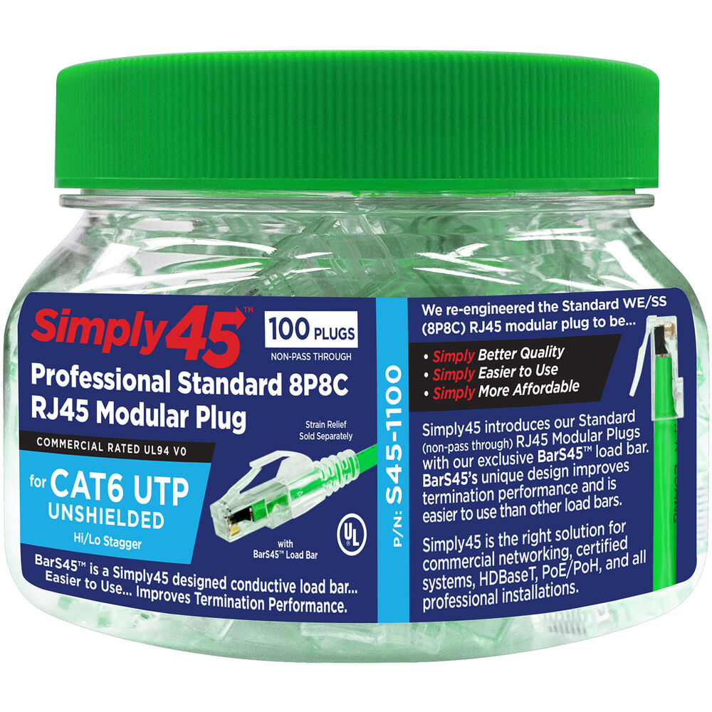 - Simply45 Cat 6/6a UTP Unshielded RJ45 Standard Modular Plug with Bar45 (100-Piece Jar)