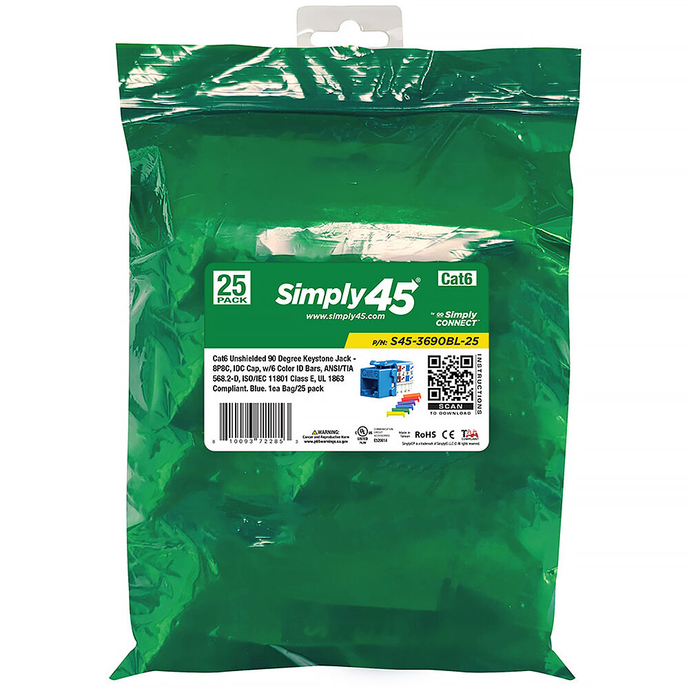 This 25-pack of black-colored Cat6 90° Unshielded Keystone Jack from Simply45 provides feed-through patching via a standard patch panel, keystone wall plate, or surface mount box. The snap-in RJ45 unshielded connector jack is simple to wire and install, and provides a robust in-line RJ45 connector with an attachable dust cap that supports Cat6 cable.