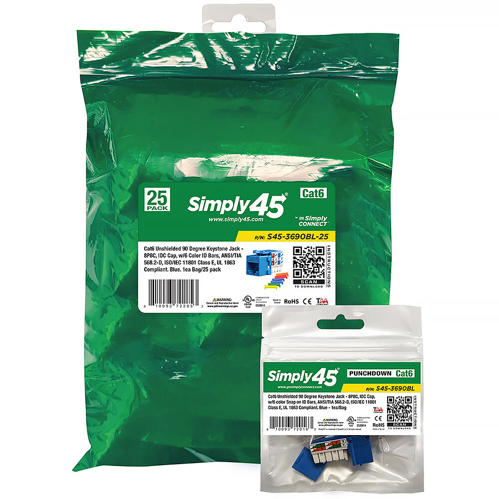 - Simply45 Cat6 90° Unshielded Keystone Jack (Blue, 25-Pack)