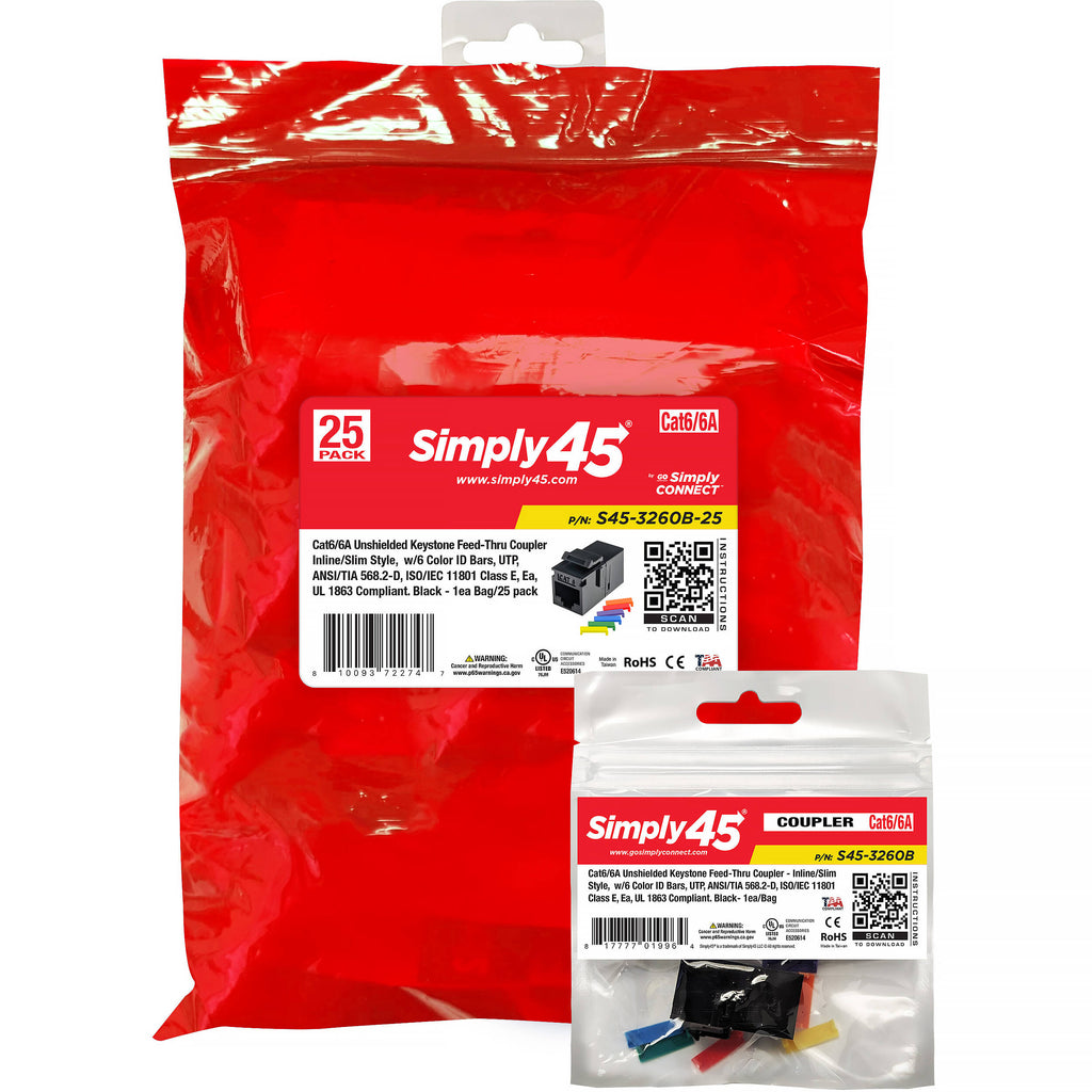 The Simply45 Cat6 UTP RJ45 Keystone Coupler includes multicolored keystone snap-on ID bars. RoHS compliant, this coupler meets ANSI/TIA 568.2-D and ISO/IEC 11801 Class E standards.