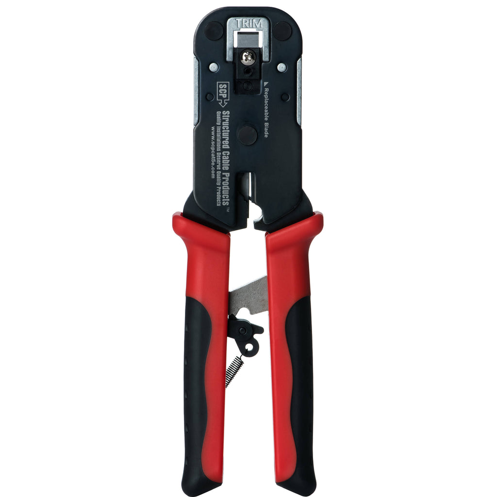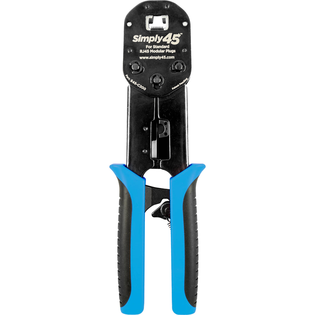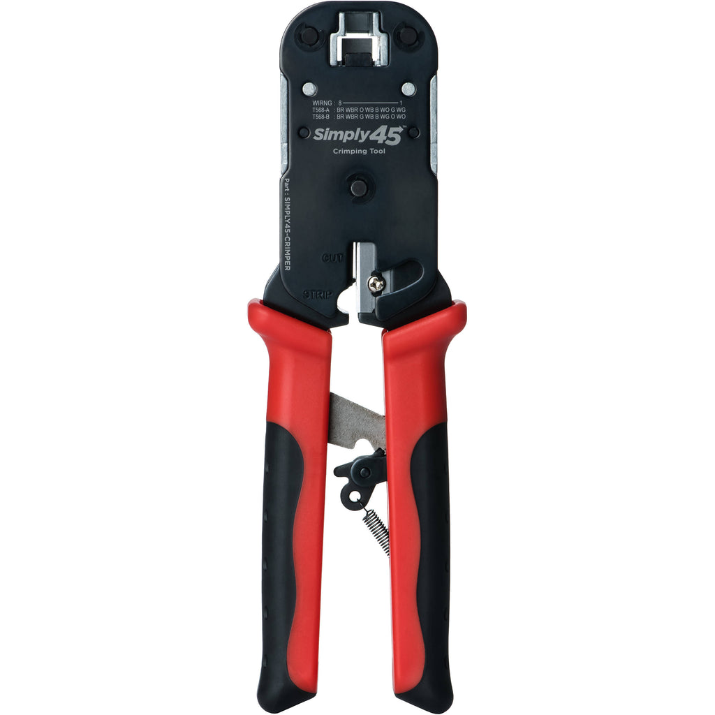 Ratcheted for Full Compression Cycle Simply45 has designed this Pass-Through RJ45 Crimp Tool ratcheted in order to ensure that the RJ45 pins are properly seated onto the wire conductors and the pass-through wires are properly trimmed. Synchronized Handles Synchronized handles compress together during the crimping cycle. This synchronization delivers consistent and even force directly to the plug socket and the wire trimming. The result is a smoother, faster, and easier crimping process. The handles open up to 4.25", allowing for more force with less hand effort during the crimping cycle. This tool uses both handles in tandem to deliver the crimping force with much less effort, and this enables you to crimp Cat 6 or Cat 6a cables with one hand. Being able to do so is especially useful when you have many terminations to complete in a day. Steel Reinforced The Pass-Through RJ45 Crimp Tool is wrapped with reinforced steel to ensure tool stability during the crimping cycle. Crimp tool stability results in a smoother crimping cycle, better pin sets, more consistent wire trimming, and greater durability over time. Improved Trimming Blade Design The Pass-Through RJ45 Crimp Tool is engineered to deliver consistent flush-to-the-plug wire trimming over time. Engineering features include synchronized crimp tool handles that allow even force to be delivered to the trimming blades, a more stable crimping socket, a fixed blade position alignment requiring no adjustments, a more precise angle with no flexing on the trimming blade, and a diamond-polished hardened steel trimming blade. Wire Alignment Pattern Wire alignment patterns type A/B are laser engraved right under the crimping socket. Simply45 also lists the pattern to match how the RJ45 modular plug is inserted into the tool. This makes it easy to provide one last check to be sure the wires are properly aligned inside the plug before crimping. As a result, you eliminate the possibility of putting the wire alignment upside down into the plug. Easy Changing of Blades Dull and worn out trimming blades are among the primary causes for improper wire trimming on pass-through RJ45 modular plugs. With the Pass-Through RJ45 Crimp Tool, about 30 seconds is all you need to change the trimming blade. No adjustments are needed. All that's required is handling a single screw. In contrast, many other crimp tools have a complex process of changing blades. Set Strain Reliefs/Boots Using strain reliefs (boots) is very important to protect the RJ45 modular plug termination. The Pass-Through RJ45 Crimp Tool features integrated strain reliefs/boots that are crimped to the RJ45 modular plug during the crimping cycle. The integrated strain reliefs are narrow. Their width is the same as the RJ45 modular plug, making them ideal for multi-port patch panels because they allow you to easily insert and remove plugs from jacks. The process is fast and secure. Additional Features This tool also offers a built-in wire cutter and wire stripper. EZ-RJ45 Compatibility The Crimp Tool works with Platinum Tools EZ-RJ45 connectors. This compatibility allows existing owners of these connectors to take advantage of the Crimp Tool right away and still be able to use the stock of EZ connectors. Ergonomic Grip An ergonomic grip reduces hand fatigue and slippage. UPC: 817777016857