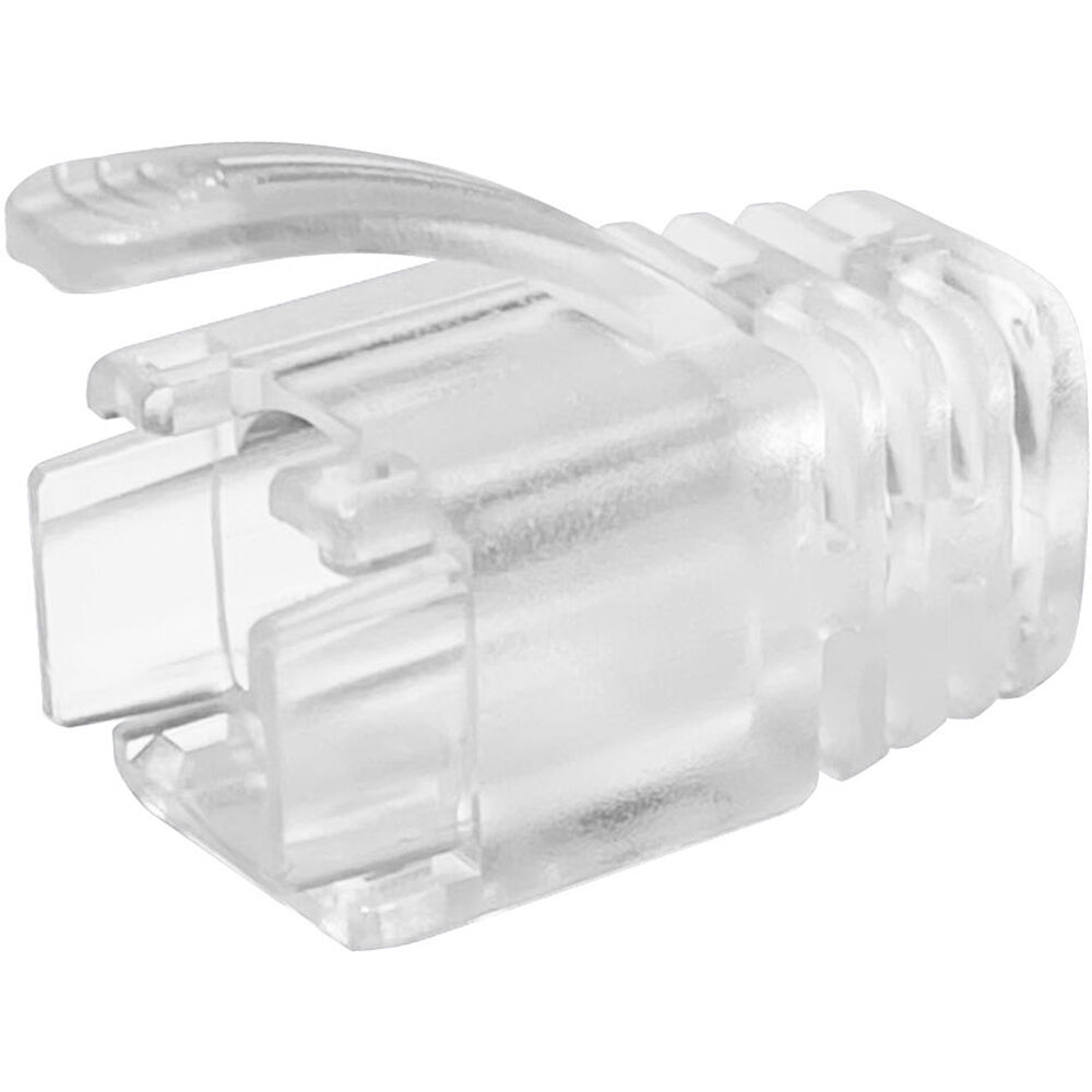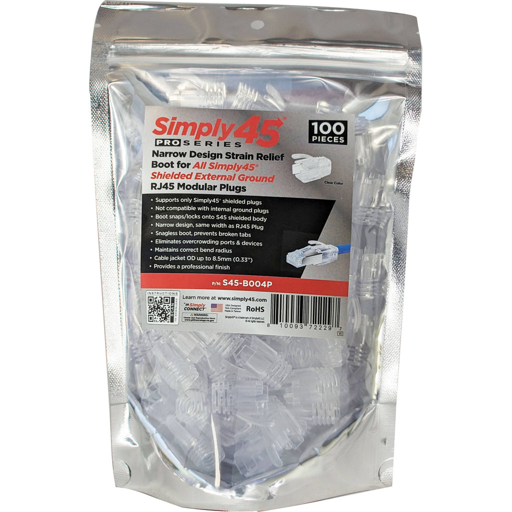This 100-pack of PROSeries Integrated Snagless Strain Reliefs from Simply45 work on all Simply45 Shielded External Ground RJ45 Modular Plugs, whether pass through or standard. The strain relief snaps onto the plug's body, locking in place. It has the same width as a standard RJ45 plug, so it won't block ports in a patch panel. It supports cable jackets with an outer diameter up to 0.33" and maintains the correct bend radius so as not to stress your cables.