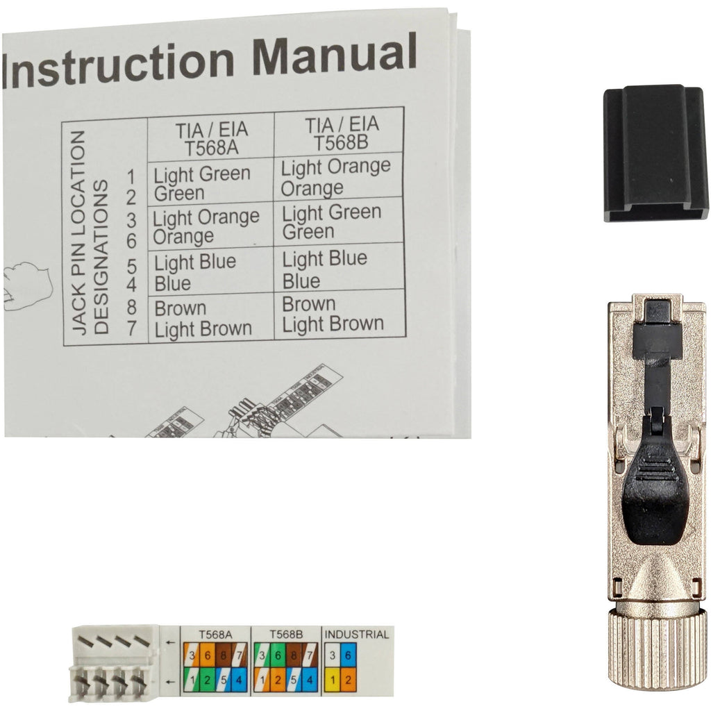 This S45-1710S 10G Rated RJ45 Shielded Field Plug for Shielded LAN Cables from Simply45 contains a field plug, load bar, wiring label, dust cap, and instructions. They combine to form a secure, shielded RJ45 cable.