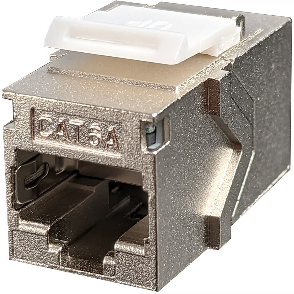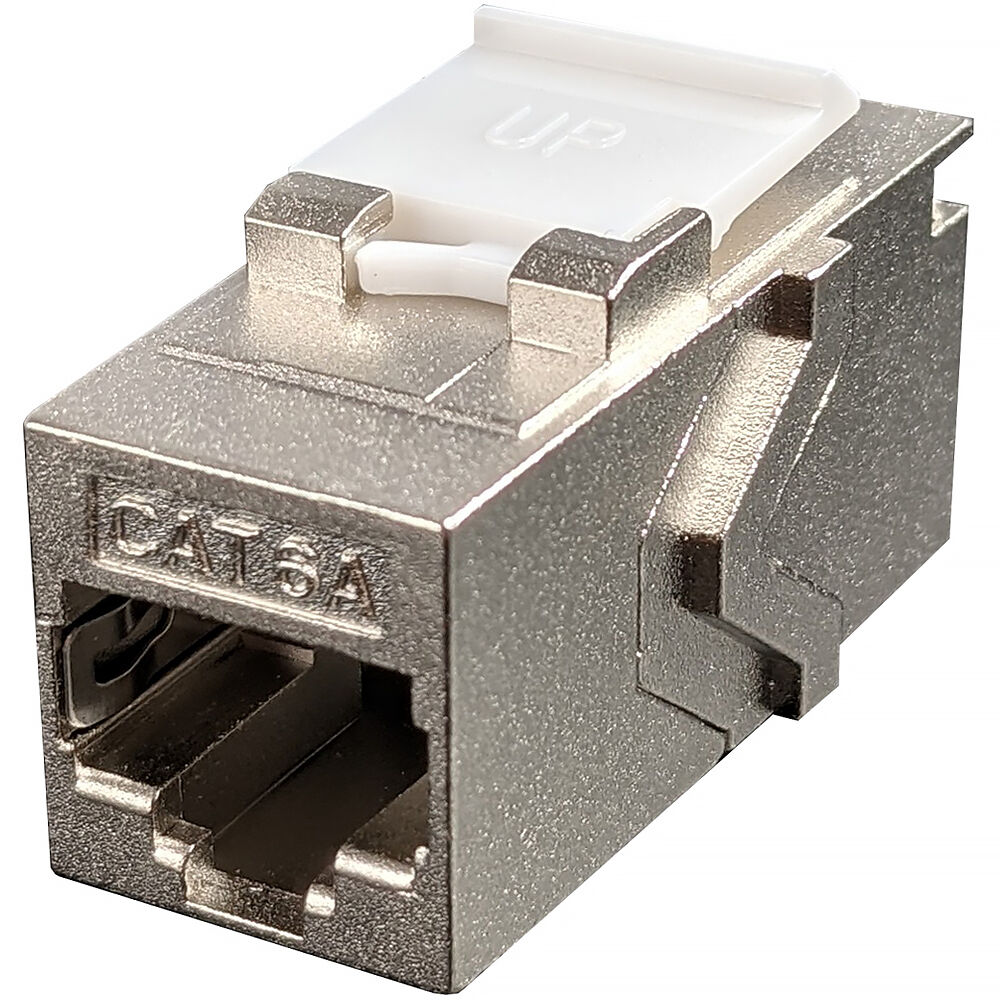 This is a 25-pack of nickel-plated 10G Shielded Keystone Feed-Thru Coupler from Simply45. Each coupler provides feed-through patching via a standard patch panel, keystone wall plate, or surface mount box. The snap-in RJ45 shielded connector jack is simple to install and provides a robust female-to-female in-line RJ45 connector coupler that supports Cat 7a, 7, and Cat 6. The nickel-plated zinc alloy metal housing shields your connection from interference and the gold-plated contacts make a good corrosion-resistant connection.