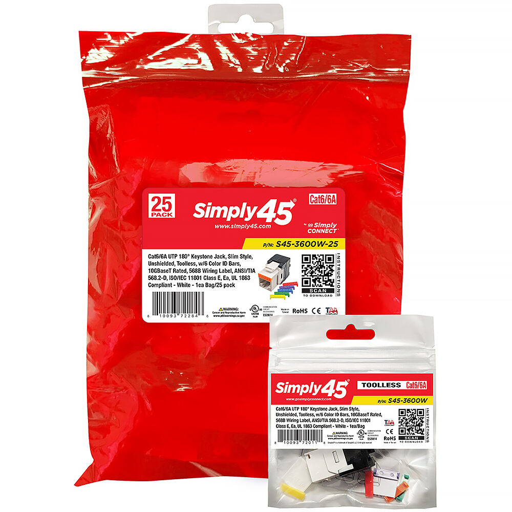 Simply45 S45-3600W-25 Cat 6/6a UTP 180 Degree Keystone Jack (White, 25-Pack)