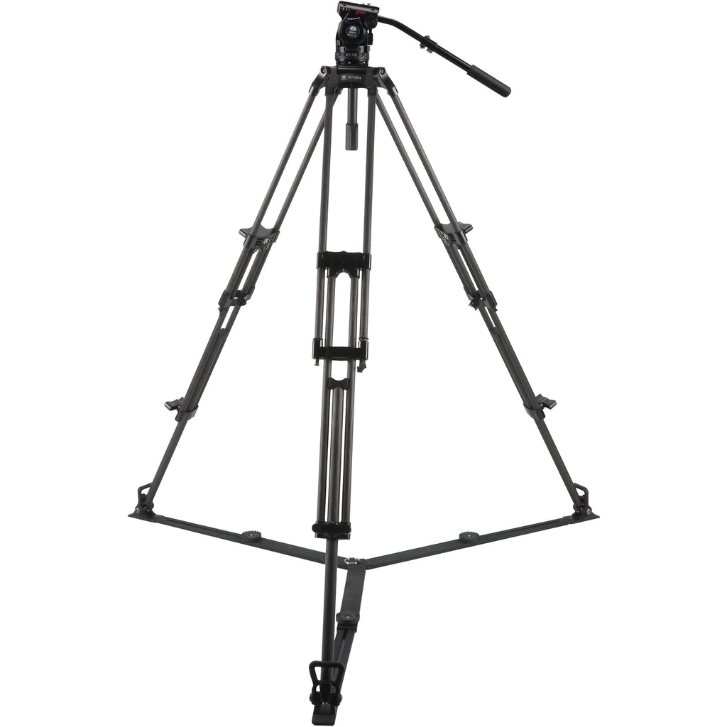 The BCT-2203 Professional 3-Section Carbon Fiber Video Tripod from Sirui features a 75mm bowl for compatible fluid heads and supports up to 22 lb loads. It offers a 17 to 63" height range and comes with ground and mid-level spreaders, both of which are removable. The ground spreader has a rubber underside for safer and more secure placement on flat surfaces. When the ground spreader is removed, dual-spiked feet are revealed for use on soft ground.