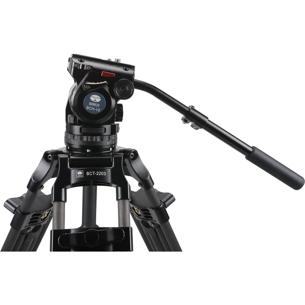 The Sirui BCT-2203 Carbon Fiber Tripod & BCH-10 Video Head Bundle features a professional 3-section tripod with a 75mm bowl and a broadcast quality fluid head with a 13.2 lb payload. The tripod includes a ground spreader and mid-level spreader and offers a 17-63" working height. The head comes with a pan bar and provides stepped counterbalance and 0-3 grades of pan and tilt drag.