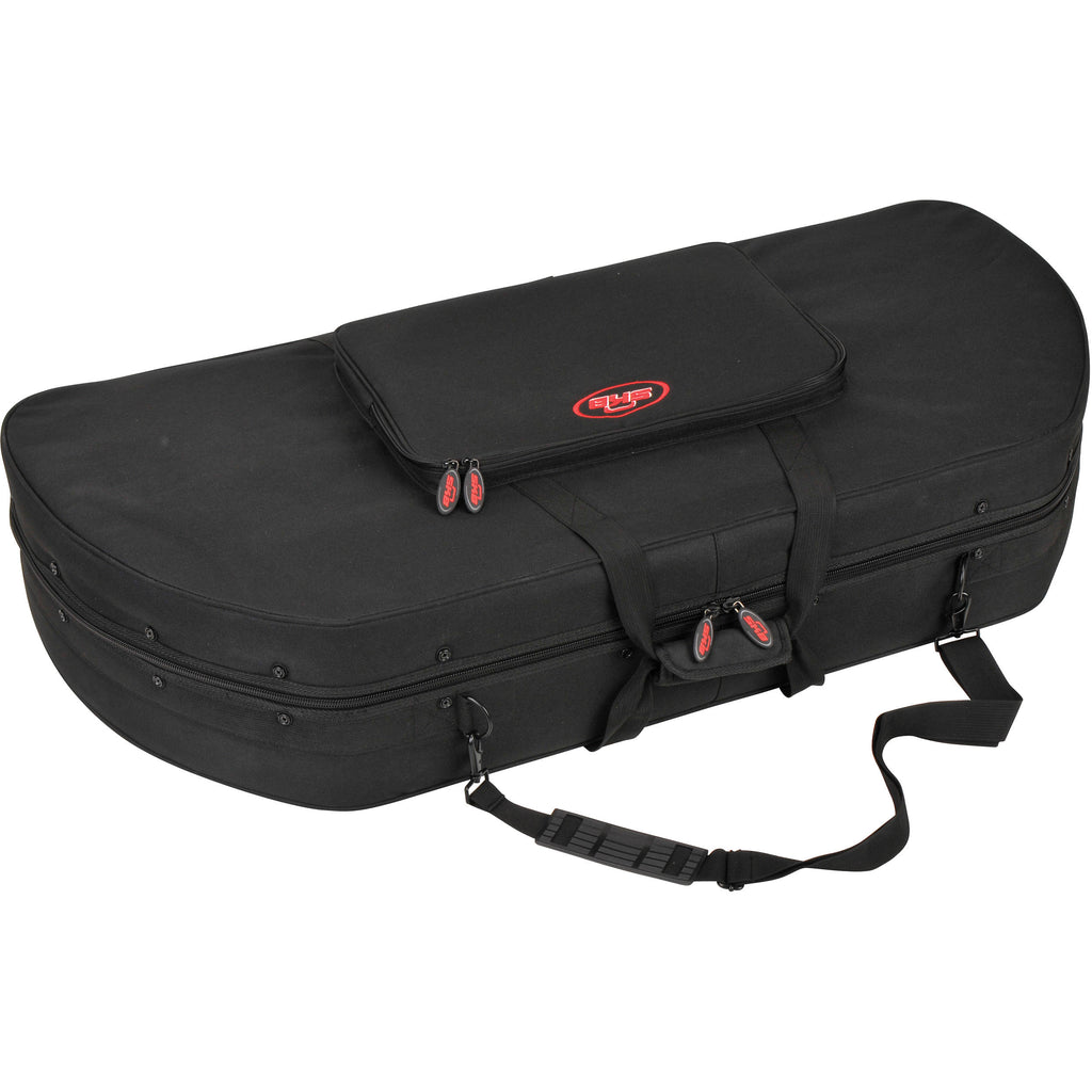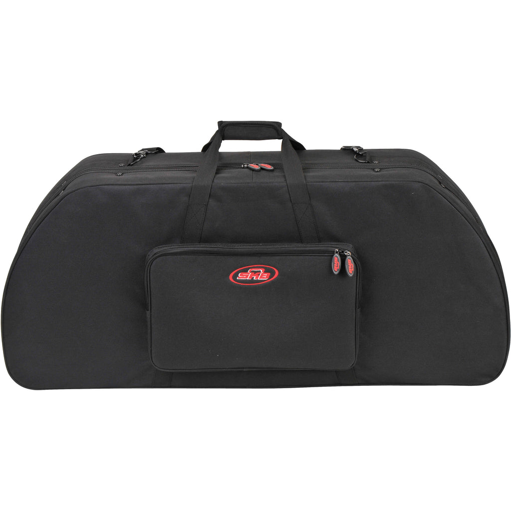 The black Hybrid 4120 Bow Case from SKB is designed to accommodate a wide variety of bows with an attached quiver and contains a storage area in the lid for arrows. The exterior of the case is constructed of a weather-resistant 600 Denier ballistic nylon and has durable double zipper pull closures with padlock loops for a user-supplied lock. The Hybrid 4120 Bow Case features an external pouch for accessories and an adjustable padded shoulder strap.