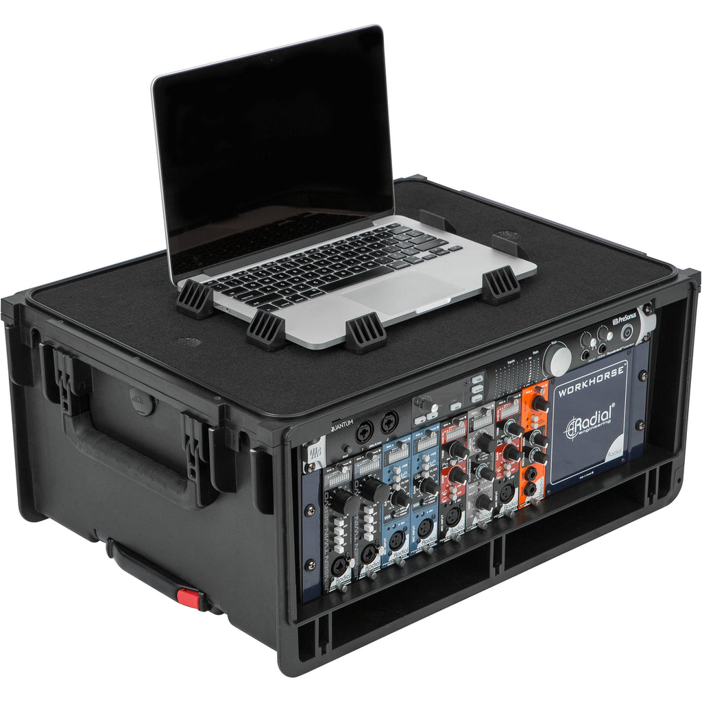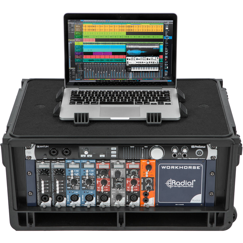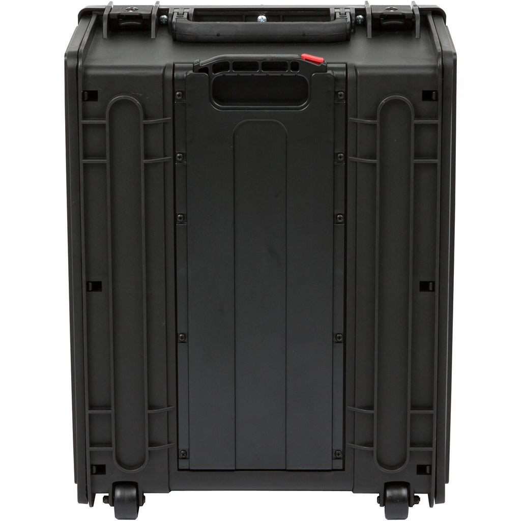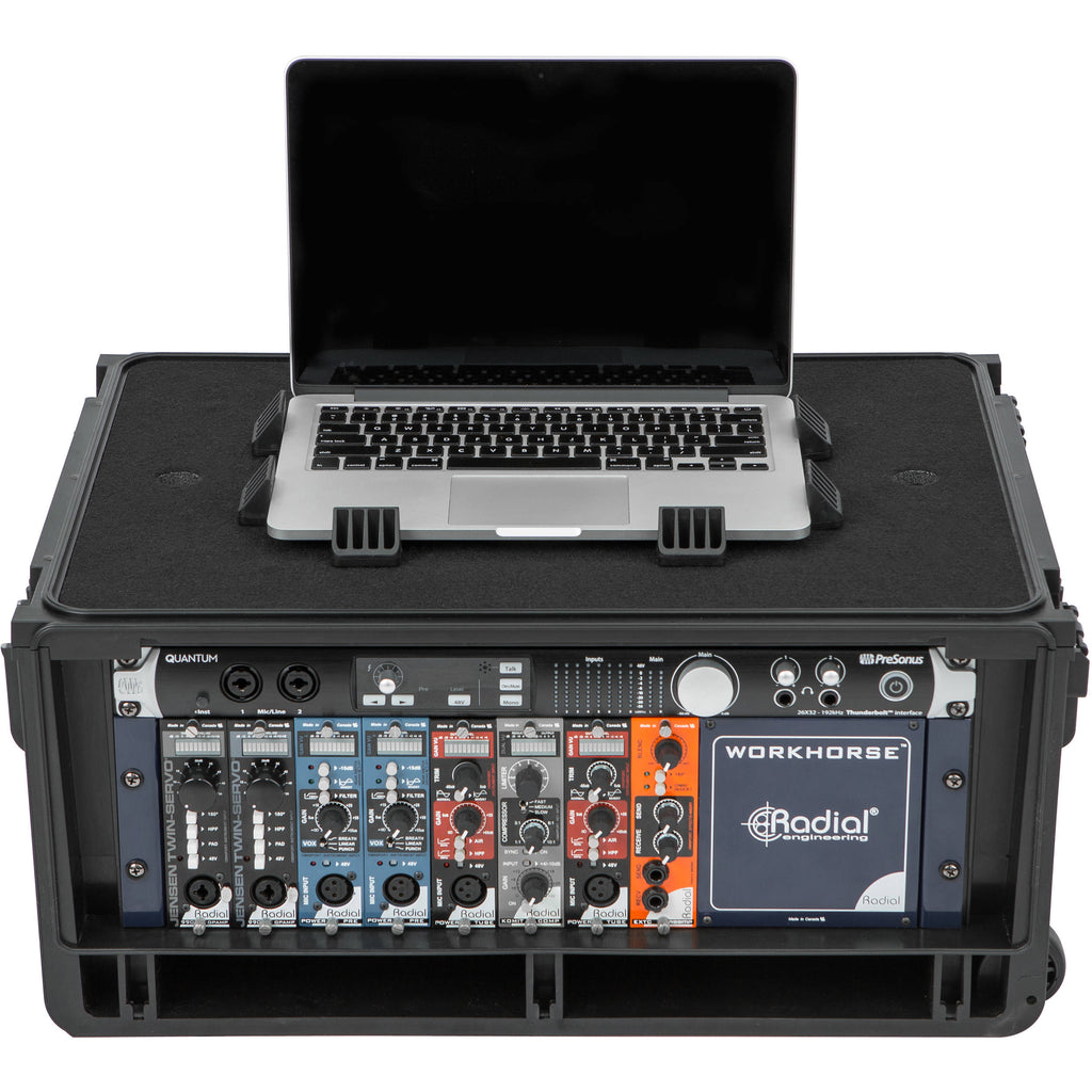 The 4-RU case's rackmounts measure 15" from front rail to rear rail to accommodate deeper equipment. It also provides a 21 x 15.5" adjustable work surface with ample room for laptops or monitors and is equipped with a molded exterior pattern that stacks securely with all SKB Roto Racks for maximum transport convenience. Other features include improved quiet-glide wheels, an easy-to-operate one-button pull handle, and TSA-accessible locking trigger latches.