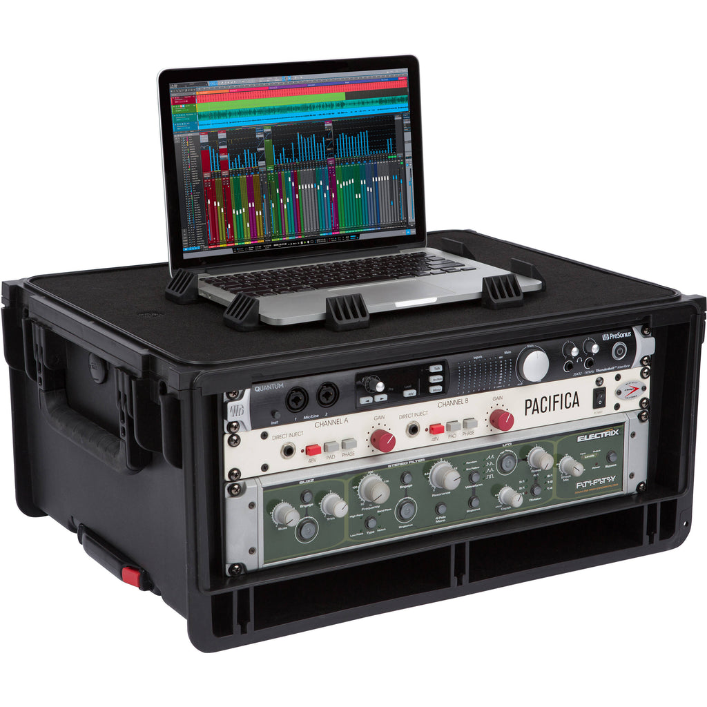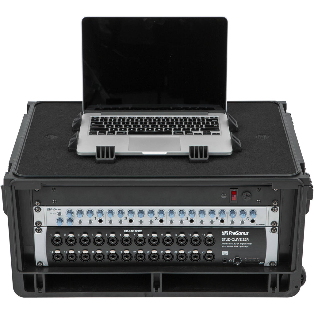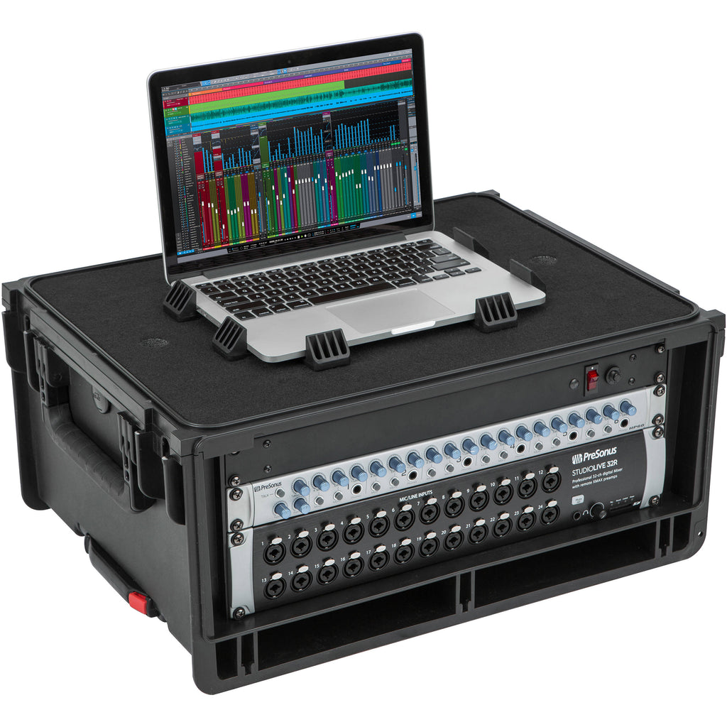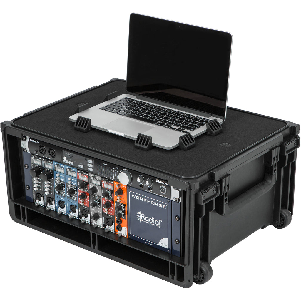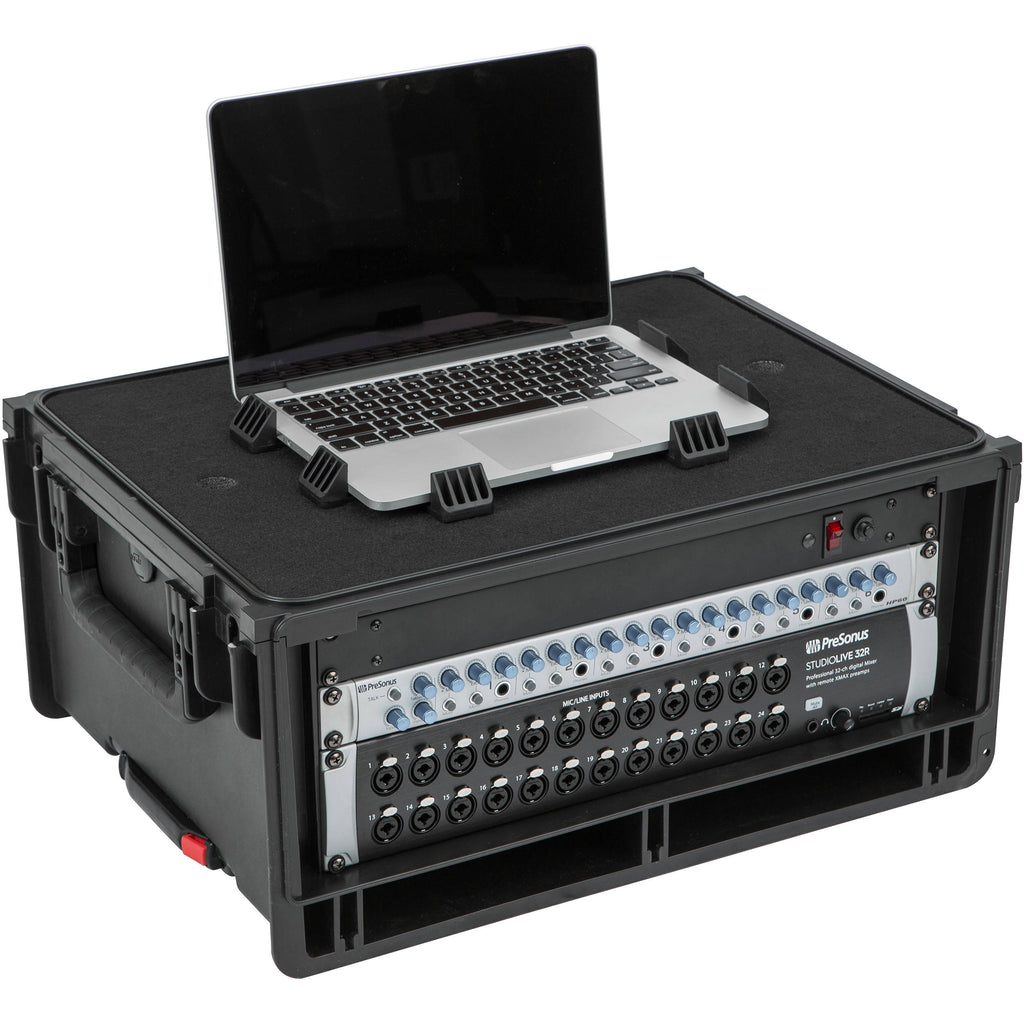 The 4-RU case's rackmounts measure 15" from front rail to rear rail to accommodate deeper equipment. It also provides a 21 x 15.5" adjustable work surface with ample room for laptops or monitors and is equipped with a molded exterior pattern that stacks securely with all SKB Roto Racks for maximum transport convenience. Other features include improved quiet-glide wheels, an easy-to-operate one-button pull handle, and TSA-accessible locking trigger latches.