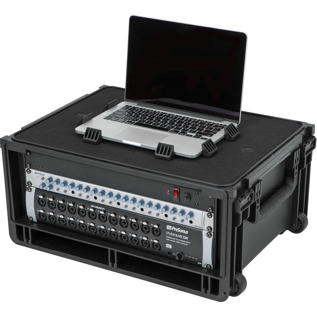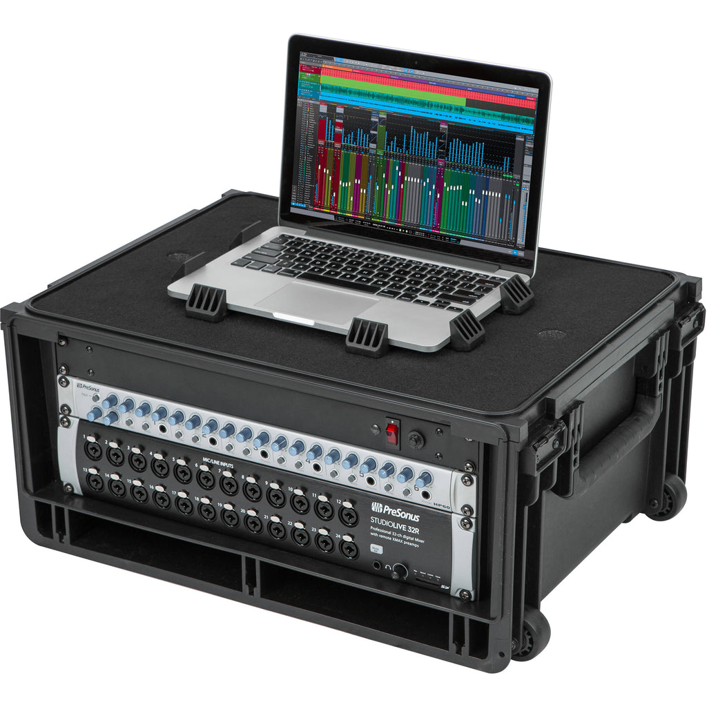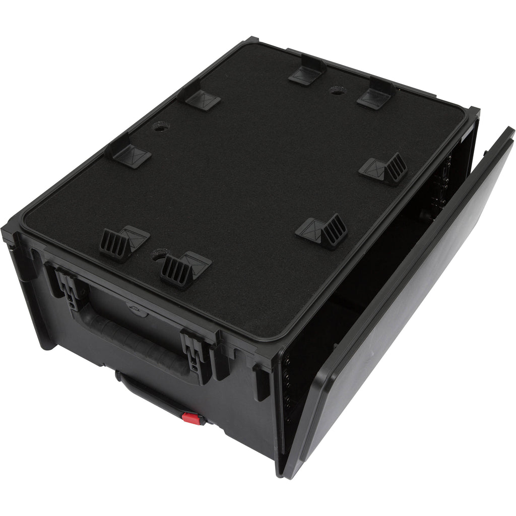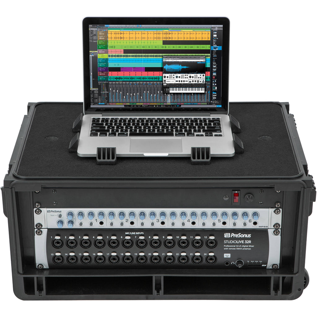 The 4-RU case's rackmounts measure 15" from front rail to rear rail to accommodate deeper equipment. It also provides a 21 x 15.5" adjustable work surface with ample room for laptops or monitors and is equipped with a molded exterior pattern that stacks securely with all SKB Roto Racks for maximum transport convenience. Other features include improved quiet-glide wheels, an easy-to-operate one-button pull handle, and TSA-accessible locking trigger latches.