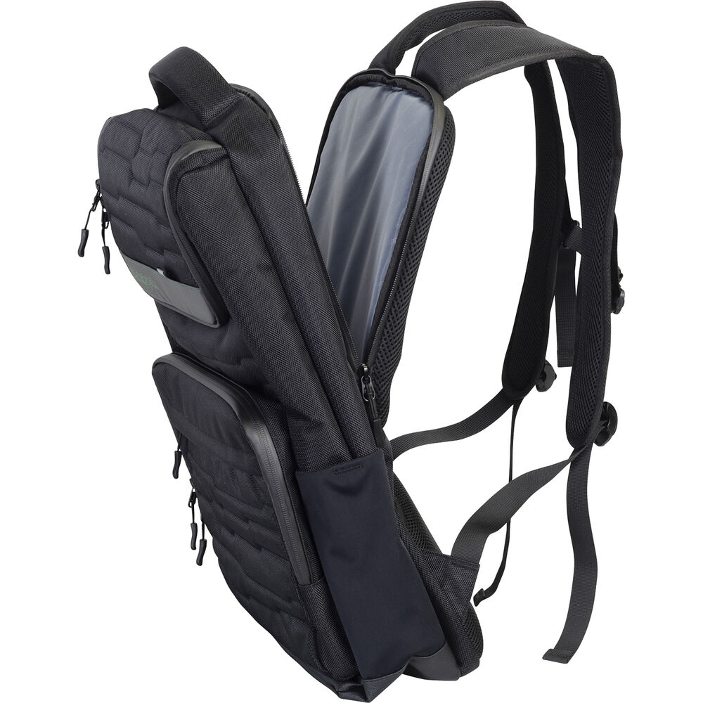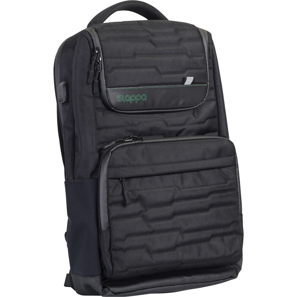 Carry your gaming laptop and gear with style and peace-of-mind with the SLAPPA Gamma 18" Gaming Laptop Backpack. This backpack fits most laptops up to 18" in a dedicated easy-to-access compartment to keep it safe and secure as you travel. It also features a rugged tech pattern nylon exterior with weather-resistant zippers, a padded carrying handle, and adjustable shoulder straps along with a USB charging passthrough port that allows you to connect phones and other portable devices to separately purchased battery banks inside the backpack's spacious main compartment. Peripherals, handheld consoles, and other small items can be stored in the convenient outer accessory pocket. The dual-zipper luggage passthrough strap allows you to slide the backpack over the handles of wheeled luggage, or it can be used as an extra accessory pocket. As an added convenience, there are two bottle-holding side pockets.