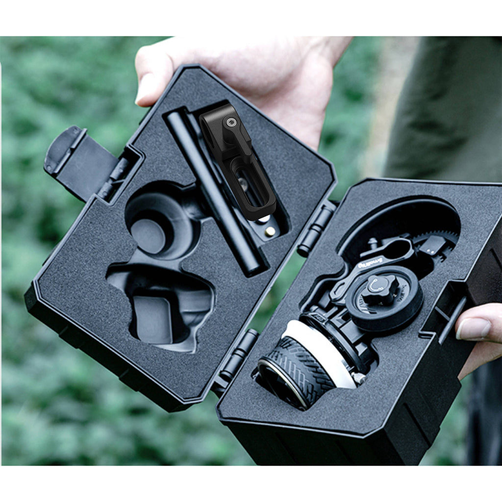 The anti-slip focus knob prevents moisture build-up and provides comfortable dampening control. The belt-style lens gear ring wraps around the lens, and different-size gear rings with different gear teeth measurements may be utilized. A replaceable marking ring is also included in the package, as well as a storage bag to protect the follow focus components.
