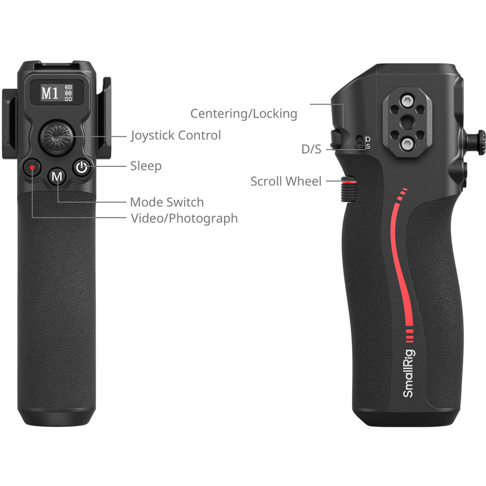The handgrip enables you to wirelessly control your DJI RS series gimbal from up to 328' away, as well as the start/stop on your camera using an optional cable. The receiver mounts onto the side of your gimbal handle using the integrated clamp, and it also provides mounting threads for arms and extensions. The handle features various buttons and joystick controls, including a scroll wheel, a D/S switch between DJI/SmallRig focus motor, and a trigger button.