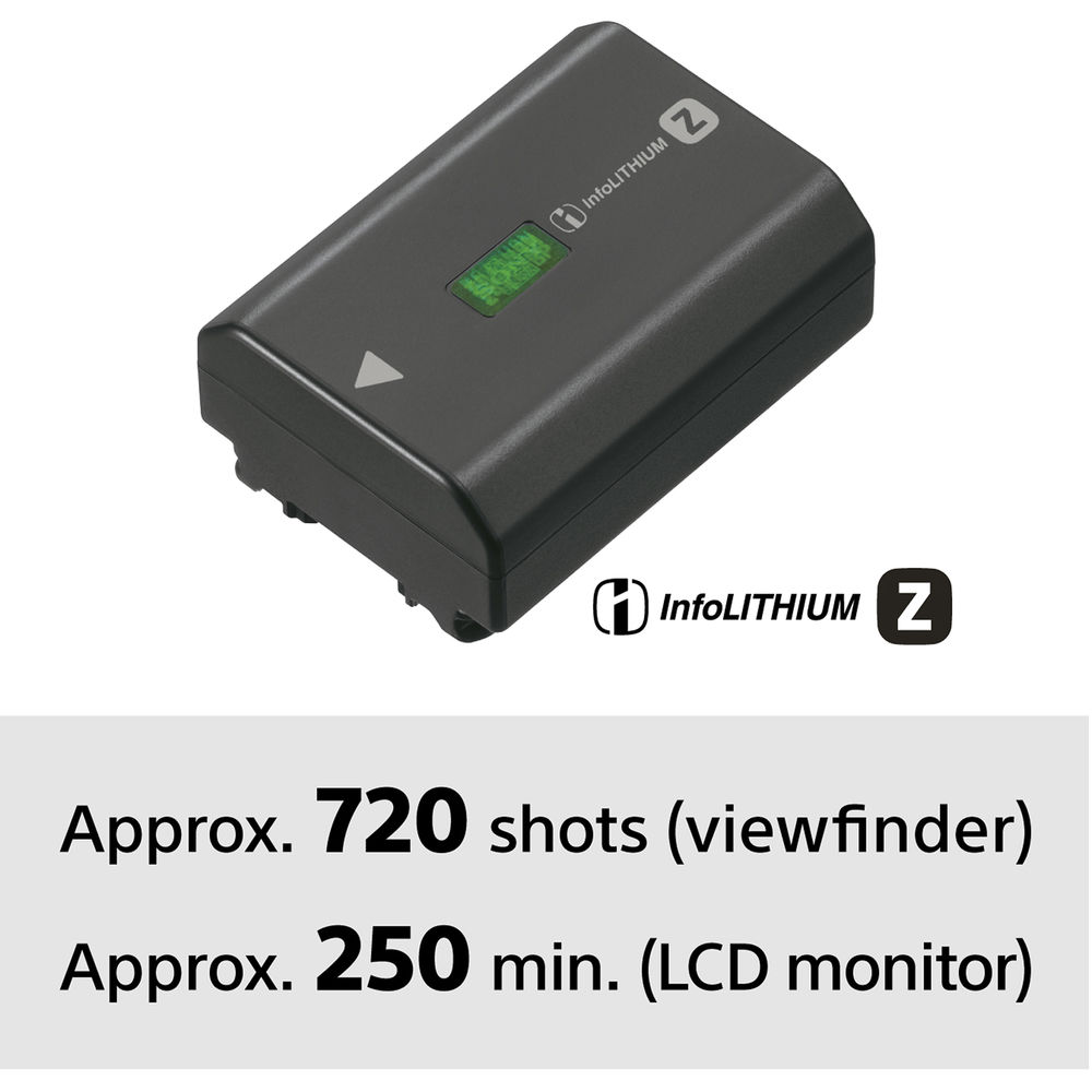 - The included NP-FZ100 rechargeable lithium-ion is rated for approximately 810 shots per charge when working with the LCD screen.