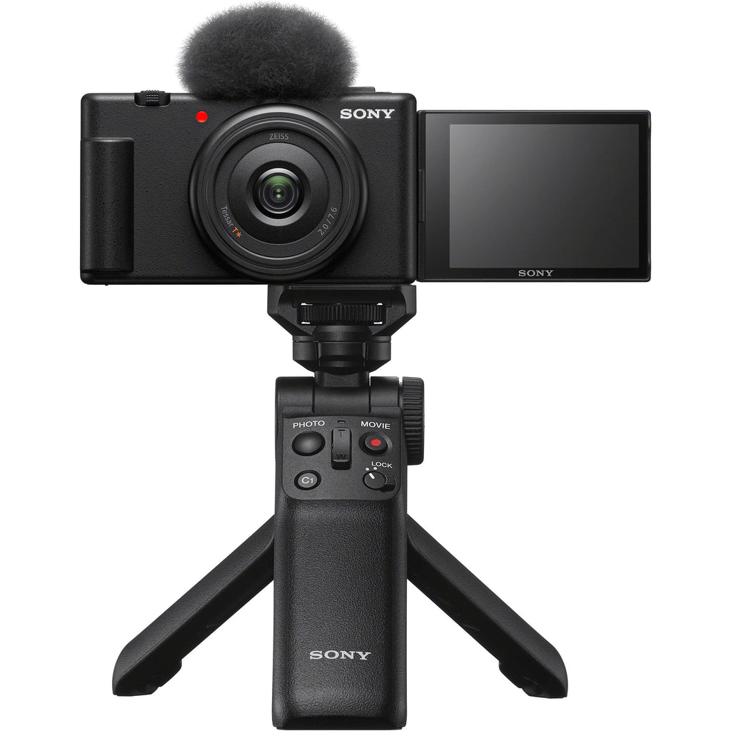 A comprehensive starter bundle for the budding content creator, the Sony ZV-1F Vlogging Camera with Vlogger Accessory Kit from pairs the black vlogging camera with the Vlogger Accessory Kit, which includes the GP-VPT2BT Wireless Shooting Grip and a memory card.