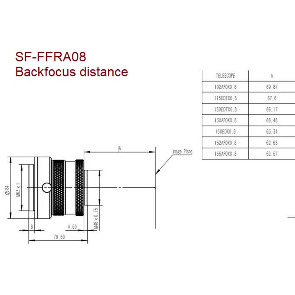 Speed up your telescope's focal ratio and achieve edge to edge sharpness with the 0.8x Adjustable Reducer for 102-155mm Refractors from Starfield. This 2.5" combination reducer/flattener has up to 17mm of adjustment for back focus, saving you the trouble of using adapters and spacers with your accessories. Simply subtract the width of any filter wheels, rotators, etc. from your back focus distance (usually 55mm) and adjust the reducer accordingly.