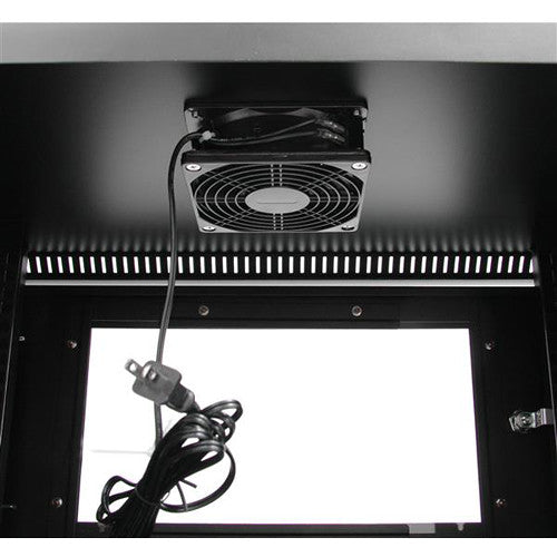 The rack features a 4.7" fan with ventilation above and below the front panel glass door, which helps to keep dust out of the rack, and a cool-operating environment for your gear. Other features of the rack cabinet include a lockable, smoked-acrylic front door that can be removed or installed to open to the left or right as needed.