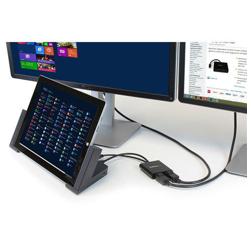 Use this adapter to connect two independent displays to a single DP 1.2 port. This MST hub lets you connect two monitors to your DisplayPort (DP) 1.2 equipped Windows laptop or desktop. It's USB powered, so the only thing you'll need to operate the hub is your computer.
