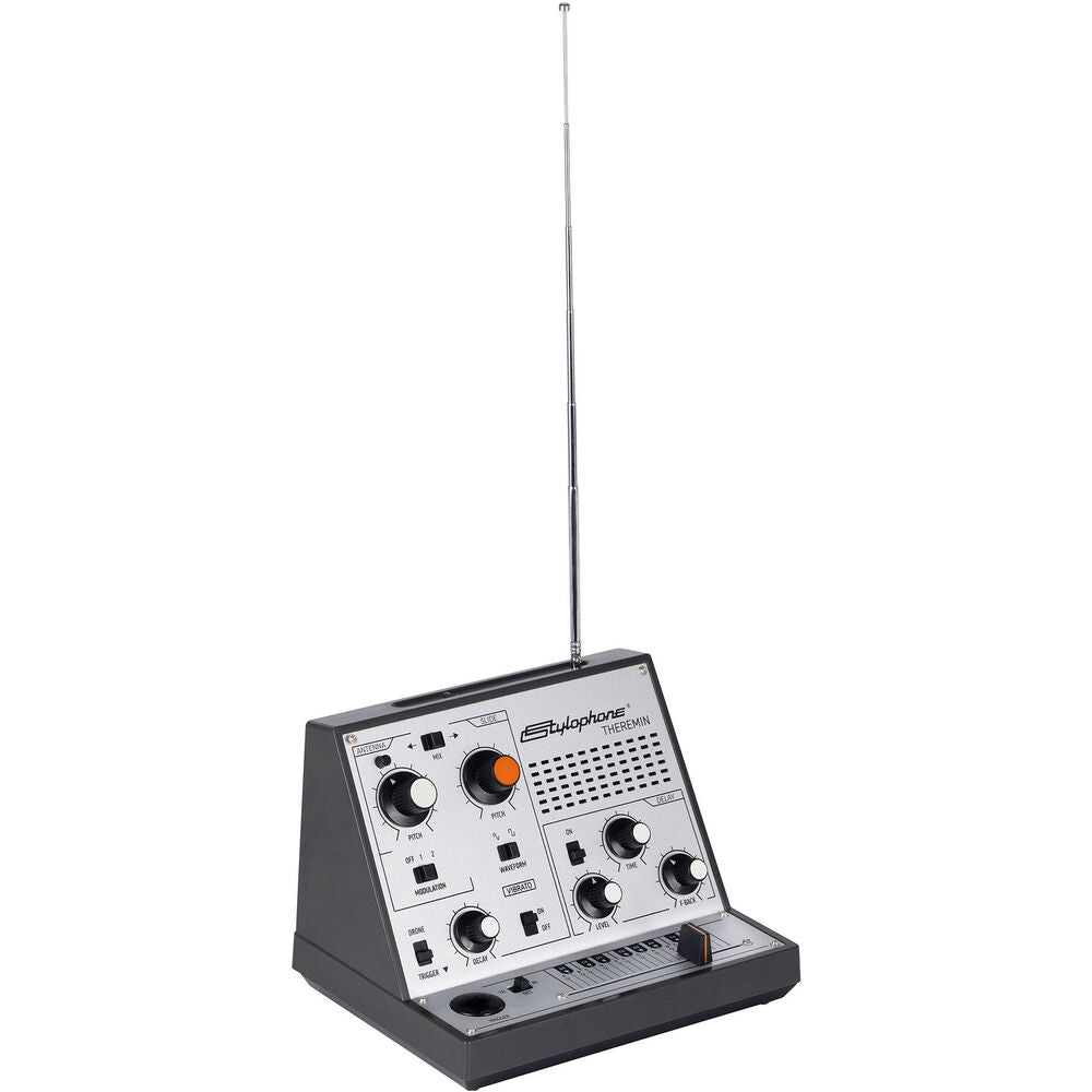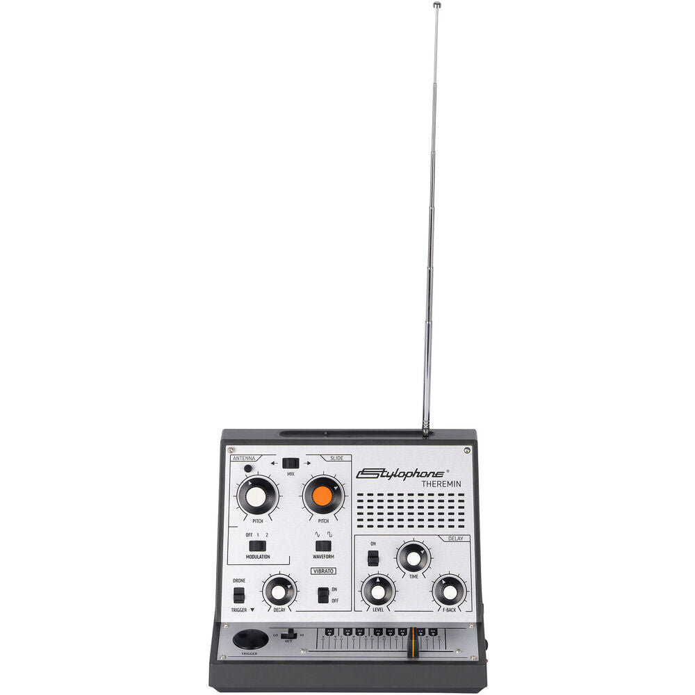 - Take your sonic experiments anywhere you go. The Stylophone Theremin is compact, powered by AA batteries (sold separately), has a built-in speaker and headphone connection, and its antenna can be easily collapsed for storage.