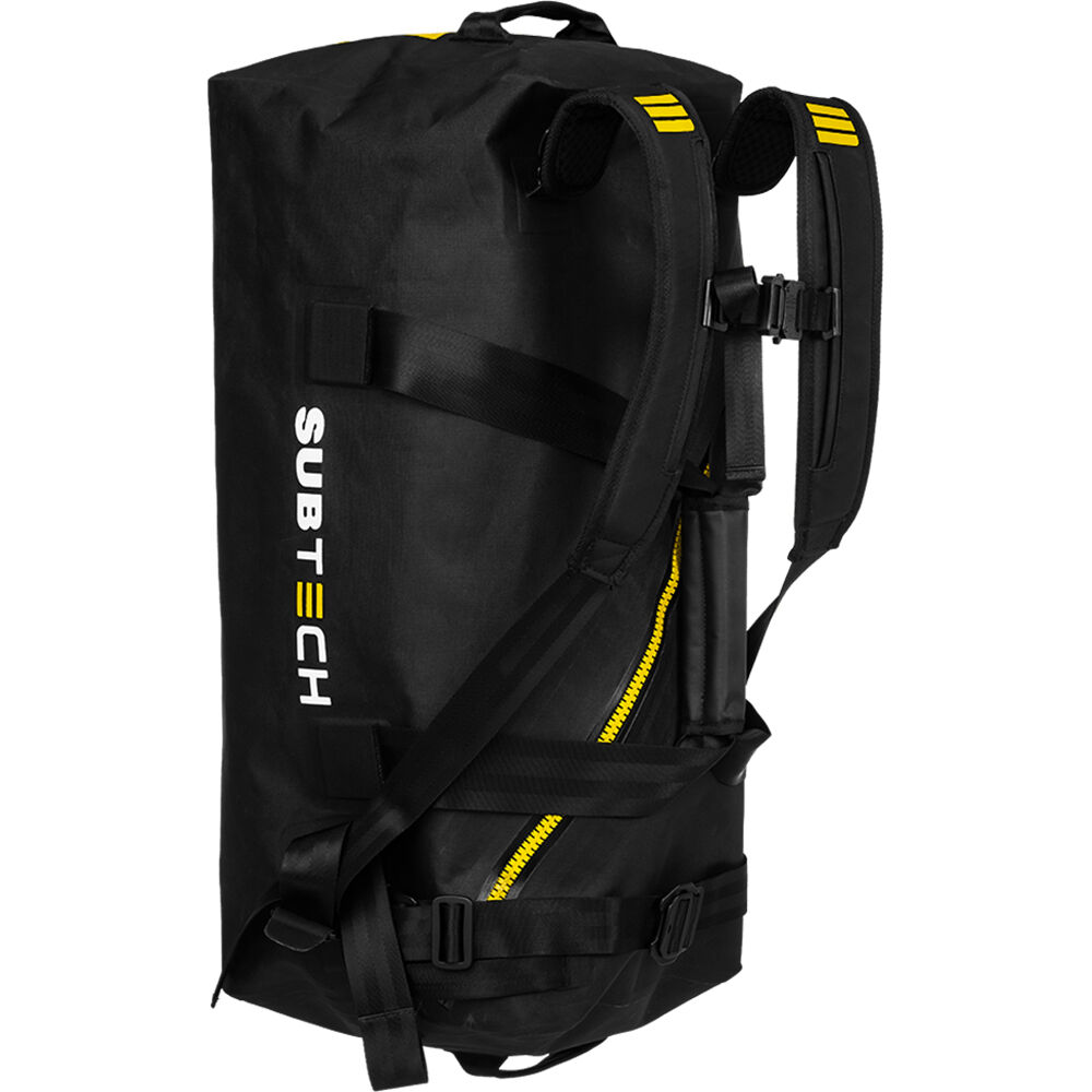 The SUBTECH PRO DRYBAG 55L is a 100% waterproof, shockproof, and floating sports bag designed for carrying sensitive gear in extreme environments. It floats on water when fully packed, even with an adult hanging onto it. It has a 55L capacity and is made with waterproof Hypalon fabric with welded seams. The zipper is pressure-tested to 500mbar/7psi to protect electronic equipment from water and condensation. The airtight zipper creates an airbag that allows an ergonomic fit of the bag along the back and spine no matter what your size or body shape.
