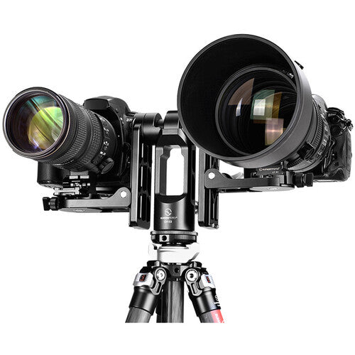 The GH-03+ Dual Gimbal Head from Sunwayfoto features dual camera platforms that move in unison to ensure fore- and aft-tilting of two cameras simultaneously, providing the same shooting angle for both. It has a robust 66 lb load capacity, making it suitable for use with large telephoto lenses. It is ideal for shooting moving subjects like in sports and wildlife photography, as well as bird watching. It features a damping adjustment knob to offset the weight of the camera and lens, plus indexed scales for easily positioning each camera's center of balance. A balanced adjustment system assures the head stays balanced even when loaded with different weights on either side.
