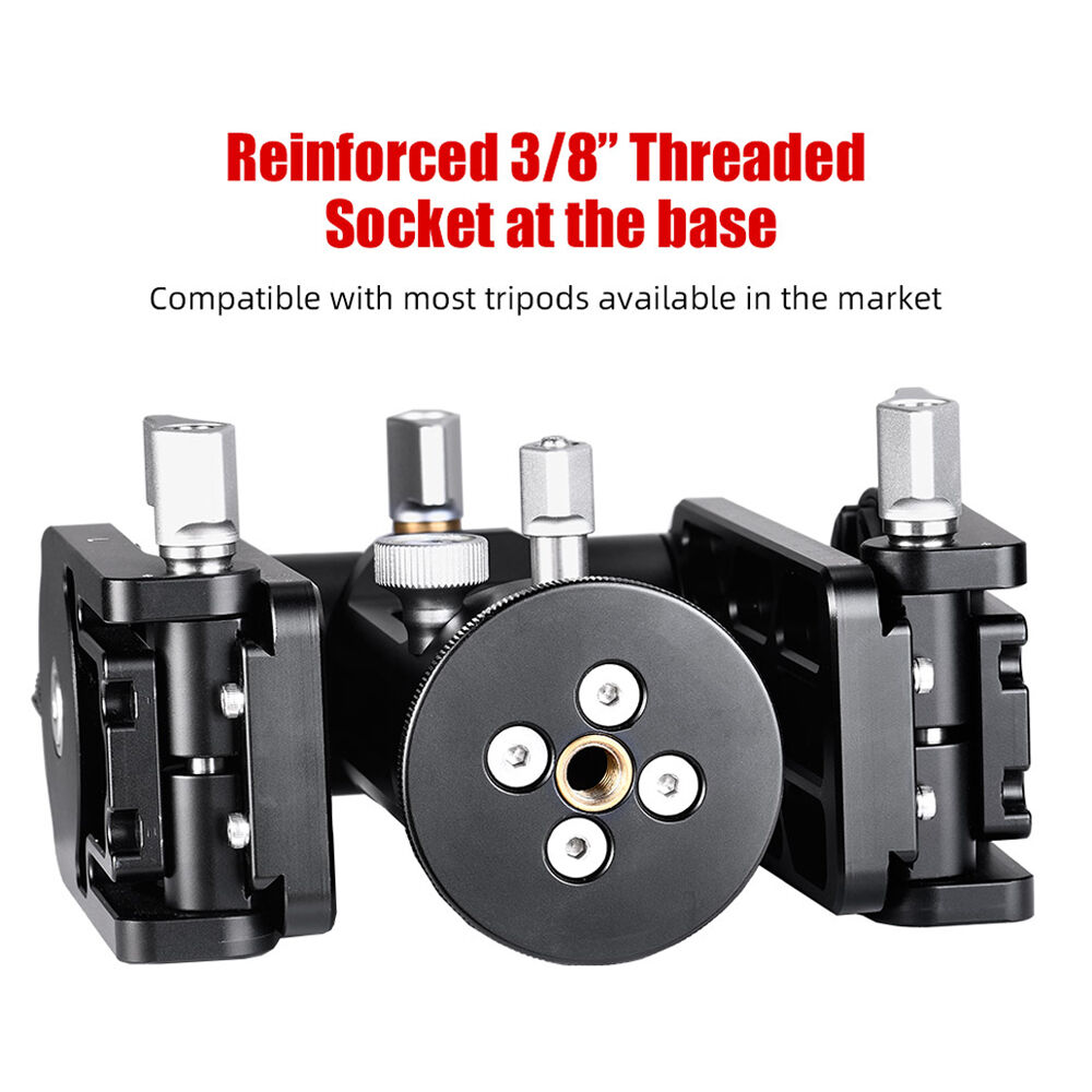 Each camera platform has an individually adjustable height range of 3.9" and an integrated safety-lock lever to immobilize the platform to avoid any impact to the camera or lens. The platforms have Arca-type quick release clamps and support quick release plates with safety screws. Each clamp provides up to 20° of rotation for more flexible camera positioning. Each platform includes a 4.7" quick release clamp, ideal for use with long lenses.