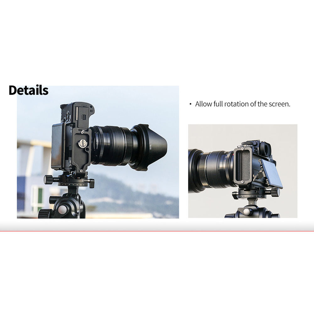 The camera mounts to the bracket via a 1/4"-20 male threaded screw, and an anti-twist lip and an alignment pin on the plate prevent and minimize any movement between the camera and the bracket. The camera's ports are completely accessible including the battery chamber, and the tilting and rotating LCD screen is not blocked.