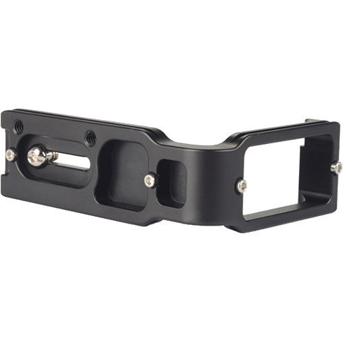 CNC machined from aluminum alloy and anodized to provide abrasion and corrosion resistance, the PNL-D810R features safety stop screws to prevent accidental release when adjusting the plate. The vertical plate is designed to allow full access to the inputs on the side of the camera, and can slide left to right to give additional clearance. A slot provides a spot for fastening a camera strap, making it easy to carry the camera while mounted to the bracket.