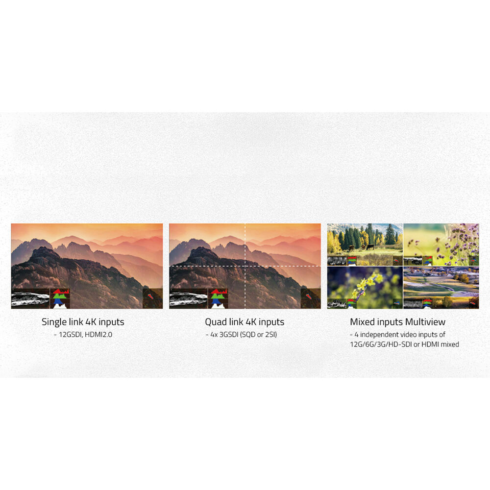 One 3G-SDI and one 12G-SDI output provide signals to a switcher or additional display. The monitor supports PbP or PiP views using the multiple interfaces.