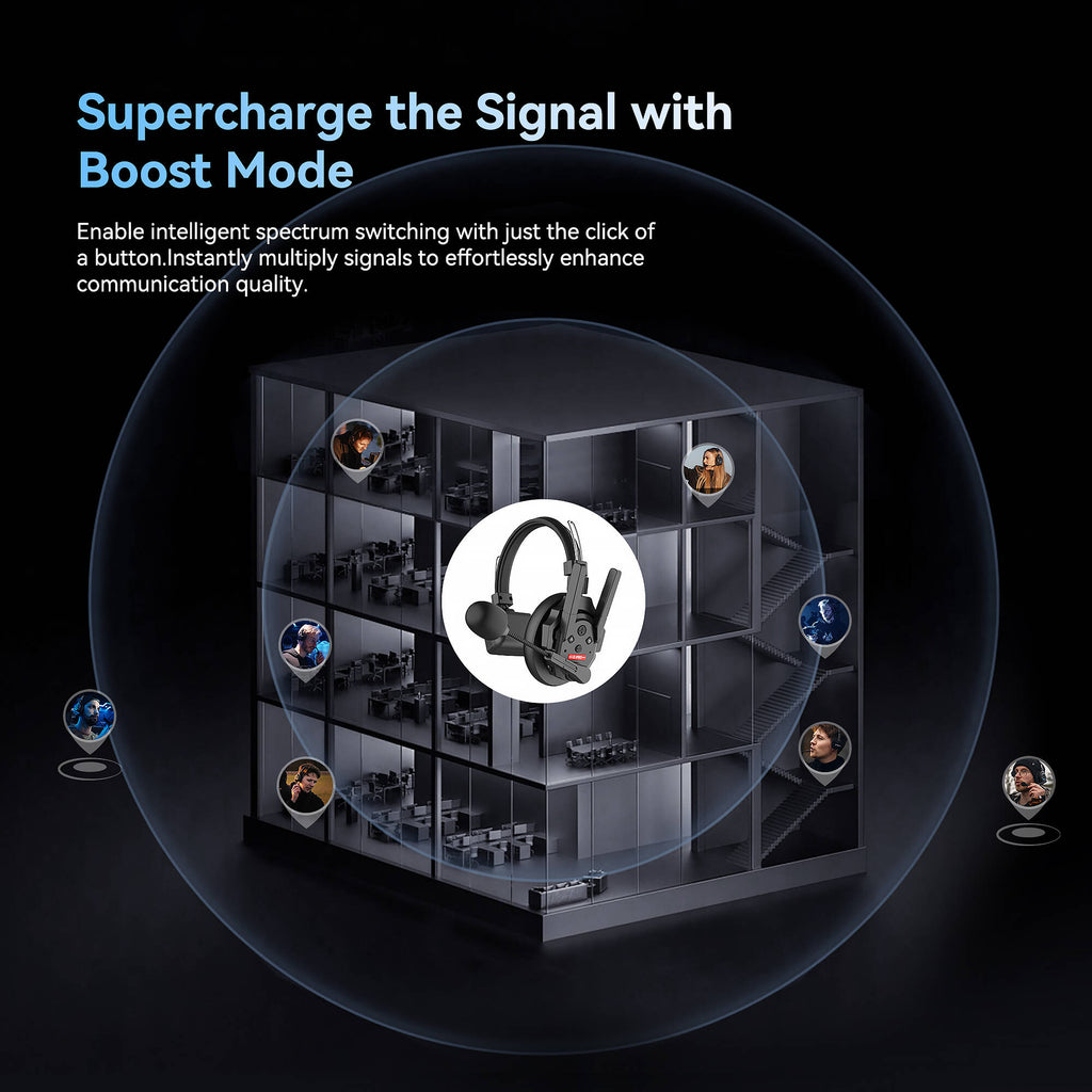 Two high-gain external antennas on the headset boost the transmission distance to up to 1640' without obstacles. Strong, anti-interference technology makes the system ideal for complex and large events. Use boost mode to engage intelligent spectrum switching to further enhance communication quality.