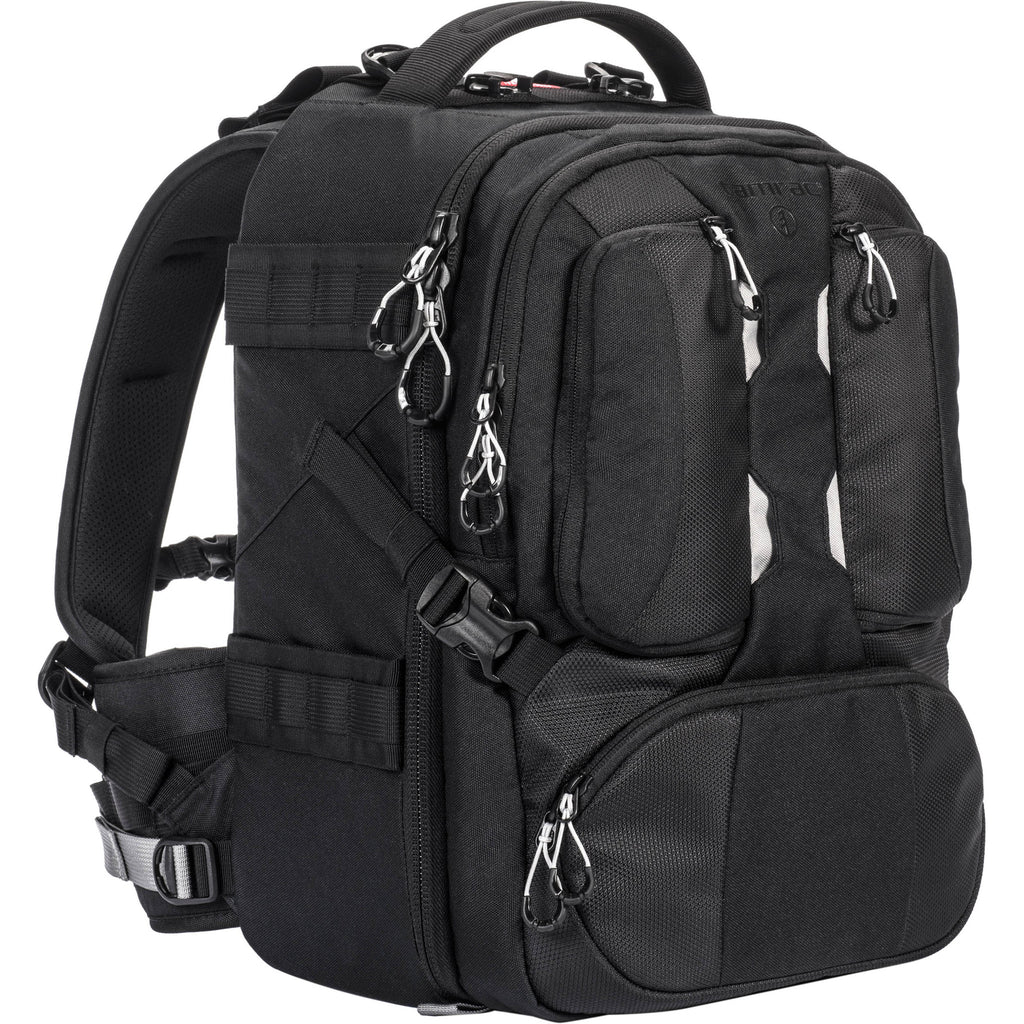 Whether an enthusiast, pro, or discerning beginner, your photography gear deserves the top quality materials and craftsmanship found in the black Professional Series: Anvil 17 Backpack from Tamrac . The main compartment features padded, touch fastening dividers for storing and organizing your pro-sized DSLRs with attached lenses, extra lenses, and accessories. Opposite your stored camera gear are three, interior, zippered, clear, accessory pockets. A zippered, exterior, padded, front compartment has an inner sleeve for storing and protecting an up to 15" laptop or other device. Exterior pockets are handy for storing items such as sunglasses, mobile phones, maps, wallet, and other necessities. Side compression straps are useful for keeping your gear free from excessive movement.
