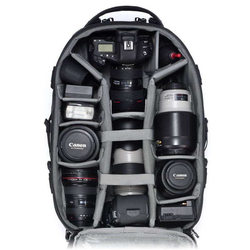Whether an enthusiast, pro, or discerning beginner, your photography gear deserves the top quality materials and craftsmanship found in the black Professional Series: Anvil 27 Backpack from Tamrac . The main compartment features padded, touch fastening dividers for storing and organizing your pro-sized DSLRs with attached lenses, extra lenses, and accessories. Opposite your stored camera gear are three, interior, zippered, clear, accessory pockets. A zippered, exterior, padded, front compartment has an inner sleeve for storing and protecting an up to 15" laptop or other device. Exterior pockets are handy for storing items such as sunglasses, mobile phones, maps, wallet, and other necessities. Side compression straps are useful for keeping your gear free from excessive movement.