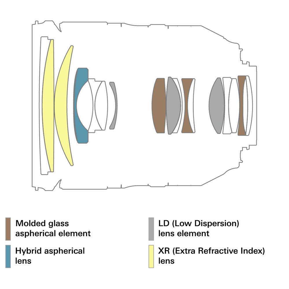 - Two XR (extra refractive) and three LD (low dispersion) elements are featured in the optical design to noticeably limit color fringing and chromatic aberrations for improved clarity, color fidelity, and apparent sharpness.