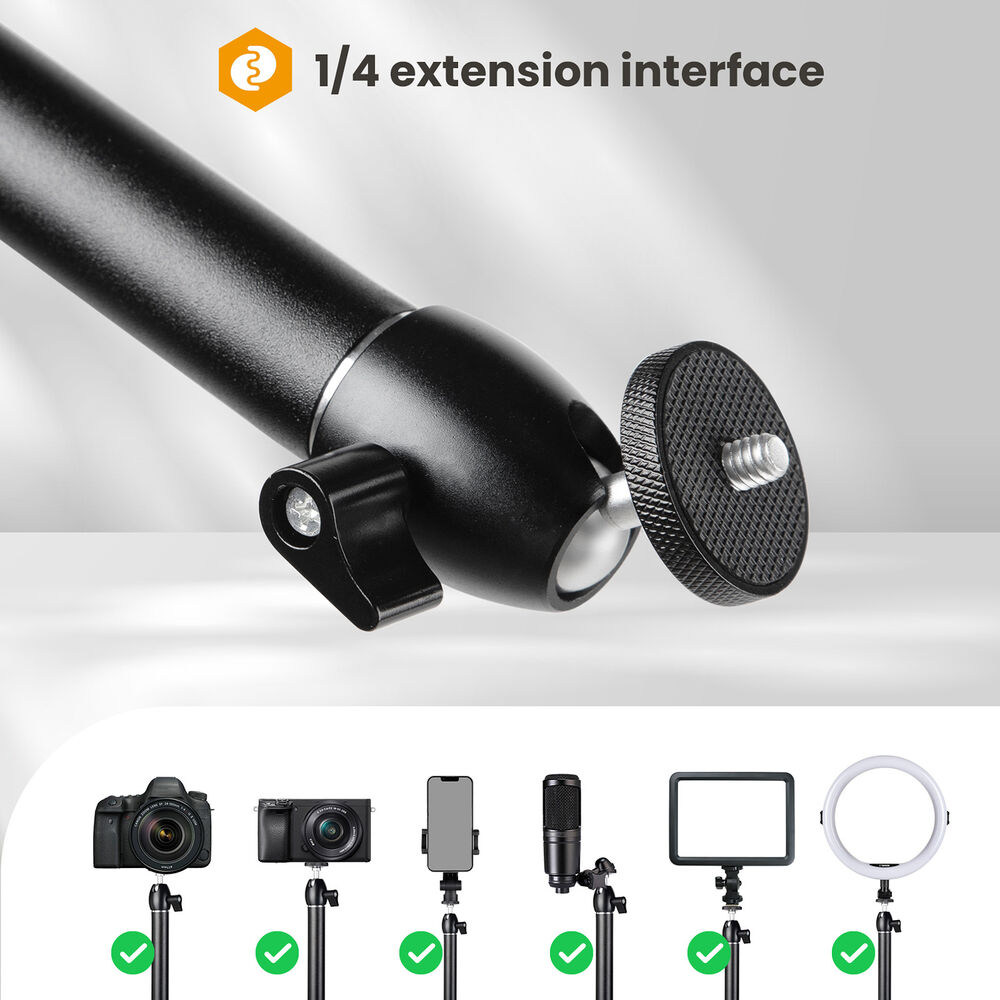 Mount your camera, microphone, ring light, or other compatible device to the sturdy 37.4" TKB01 Camera Desk Mount Stand Articulating Arm from TARION. The top 1/4"-20 ball head connects to the stand via 3/8"-16 screw, enabling support up to 4.4 lb horizontally. The featured C-clamp allows convenient and firm desk mounting. The aluminum-alloy mount stand tubes measure 1.18" in diameter. The individually adjustable gear joints allow ample flexibility with 360° of rotation.