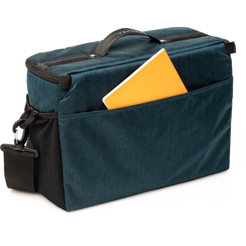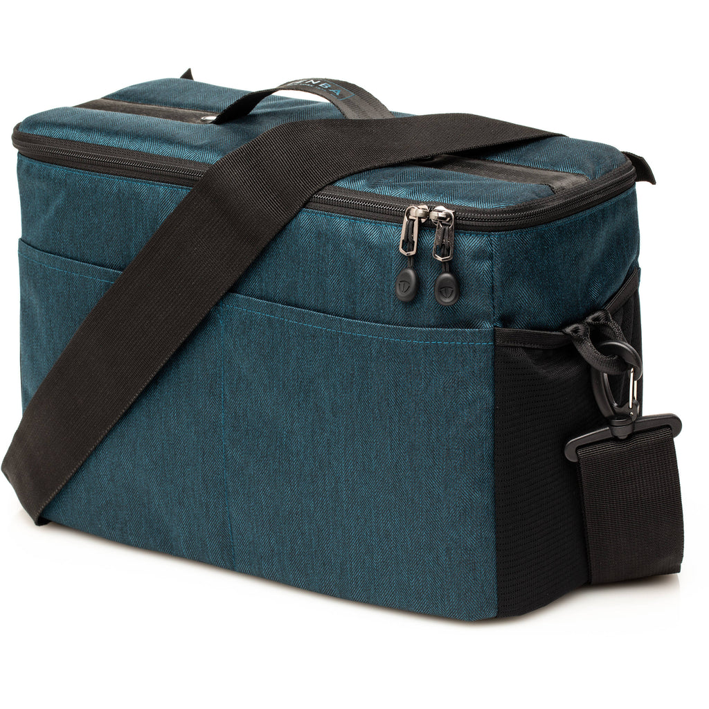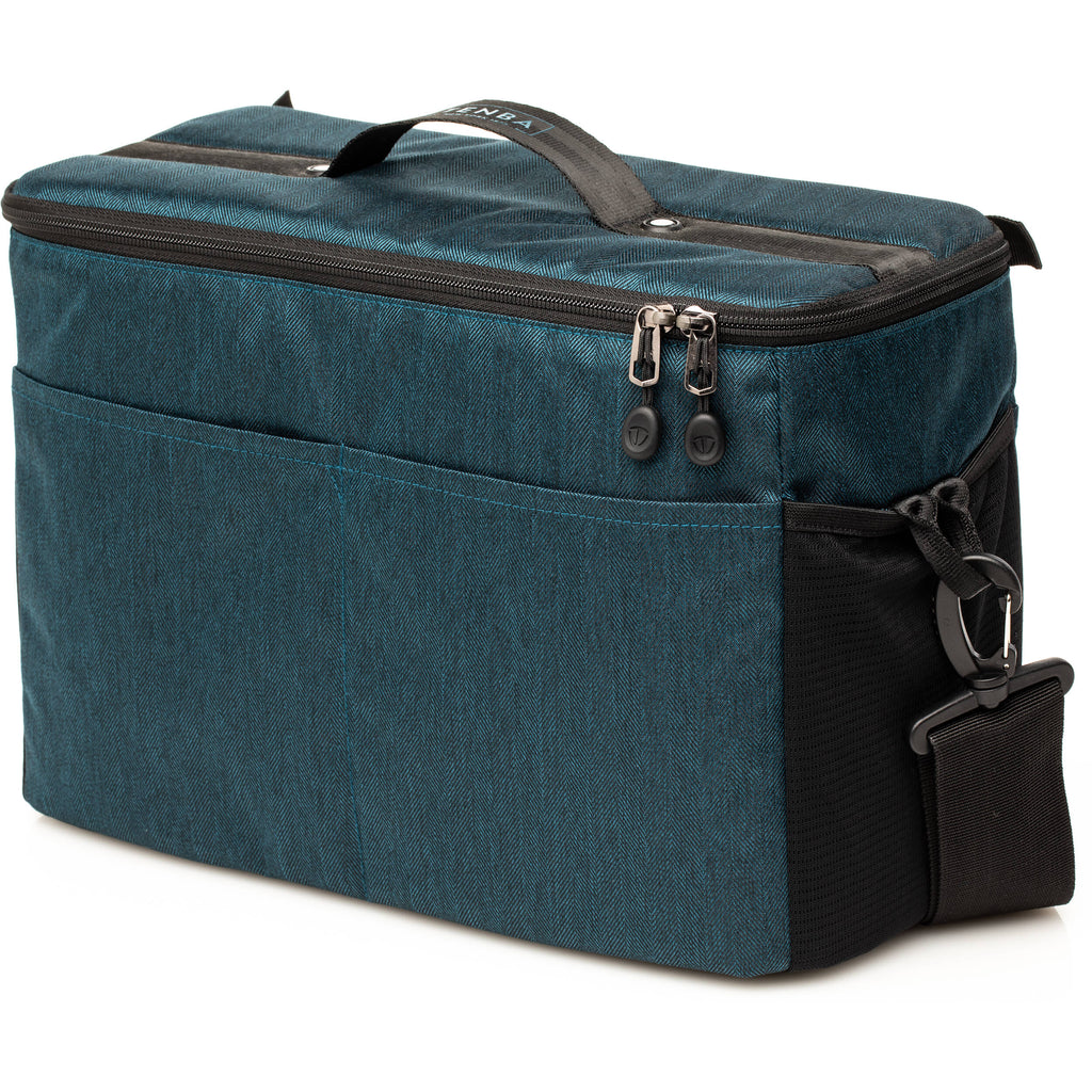 The blue BYOB 13 Camera Insert from Tenba is designed to carry and protect a camera and gear inside other non-camera bags including larger backpacks, suitcases, or handbags. Its soft outer shell molds to the shape of many different types of bags. The BYOB 13 will hold a DSLR camera body with up to 3 lenses and accessories including an attached 70-200mm f/2.8. Padded interior dividers are adjustable to fit multiple configurations and the soft-brushed tricot-lined interior will not scratch your equipment. The insert features a zippered top cover that can be folded back and stowed to allow easy access to your gear plus a handle for carrying and quick removal of the insert. Stretchy mesh pockets provide a place to store your phone, camera and lens accessories, or other items and zippered interior pockets can secure smaller more valuable items. In addition there are front and rear pockets for additional acessories and a D-ring to attach keys, a carabiner, or tethered media wallet.