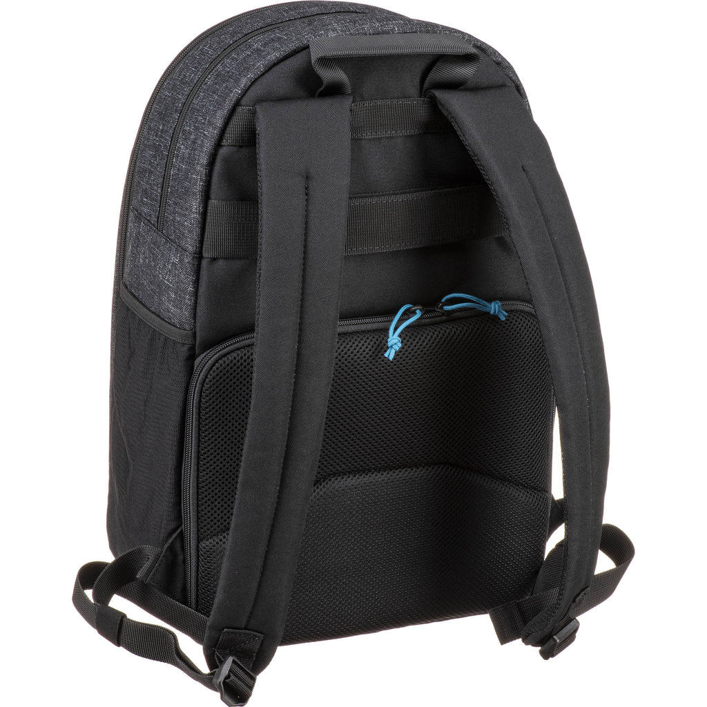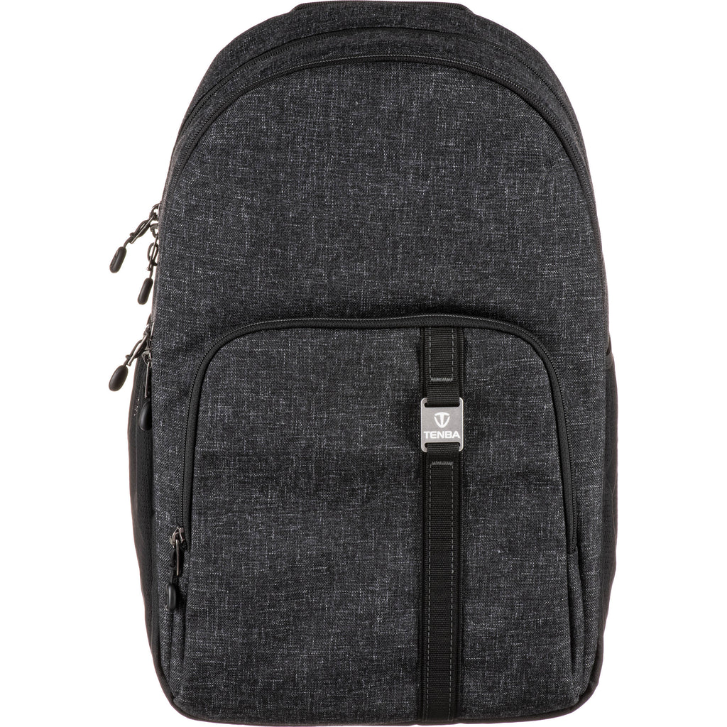 The Tenba Skyline 13 Backpack in black is made from water-repellent polyester and has durable reinforced stitching for long-term use. It holds a mirrorless or pro DSLR camera with an attached 70-200mm lens, two additional lenses, and a flash. The rear camera compartment closes securely via the YKK zipper. The top daypack storage compartment holds a jacket, a smartphone, plus other necessities, and the front pocket holds a 13" laptop. The bag is carried via the backpack straps or the top handle, and to get through the airport quickly you can conveniently slide the rear trolley strap over your luggage handle. A decorative laser-engraved aluminum badge on the front allows you to easily identify the bag from a distance.