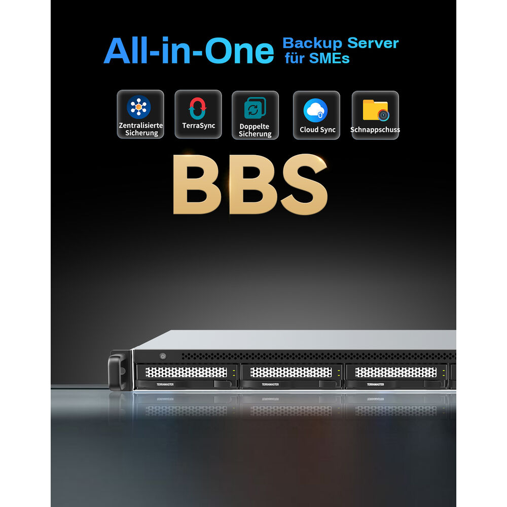 BBS (Business Backup Suite) is a comprehensive commercial backup solution developed by TerraMaster. Its core components include Duple Backup (DB), Centralized Backup (CB), TerraSync (TS), CloudSync, and Snapshot. Duple Backup is designed for off-site disaster recovery of data on TerraMaster backup servers. Centralized Backup handles the centralized backup of data from employee computers, file servers, virtual machines, and more to the local TerraMaster backup server. TerraSync enables data synchronization between multiple backup servers and between backup servers and PCs. CloudSync facilitates cloud-based disaster recovery solutions. The Snapshot feature provides snapshots and restoration of file systems and folders, offering protection against ransomware attacks.