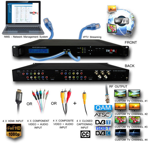 All four channels can be independently configured for either multicast or unicast outputs, while the closed captioning is supported on a dedicated analog 608 CC port with RCA connector. Any 720 or 1080 line standard video signal in either HDMI or component format can be used for each of the four channels. This system can be configured with firmware for either QAM, DVB-C, DVB-T, or ATSC channel format output.