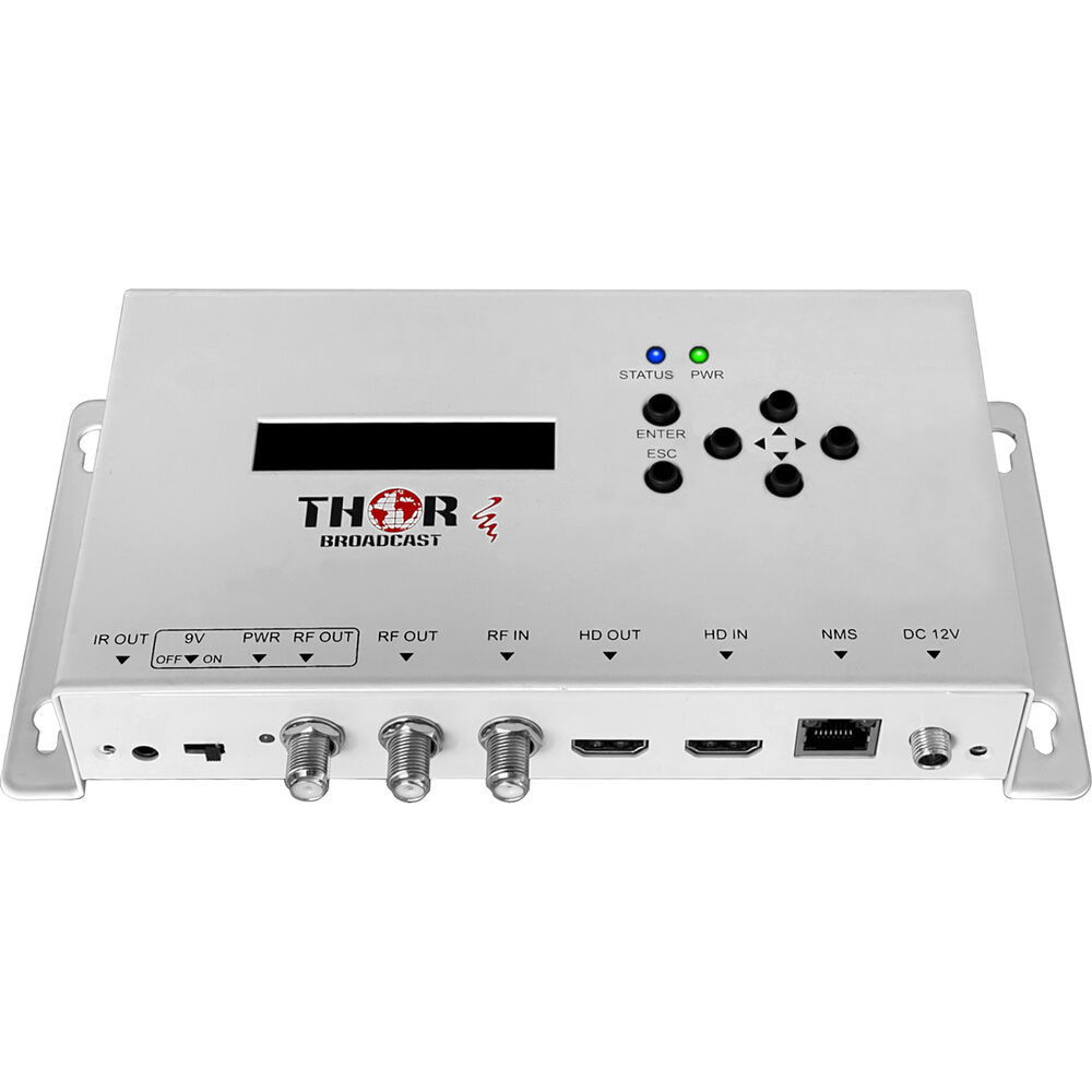 The Petit HDMI RF Modulator with Loop-Out and IR from Thor is a compact, HDCP-compliant modulator with an HDMI input and an HDMI loop output that can send out video signal with resolutions up to 1080p30. An LCD display and control buttons make it possible to set desired settings and functions directly on the unit, or you can connect an Ethernet cable to the modulator's NMS port and link that to a computer for control over a Web GUI.