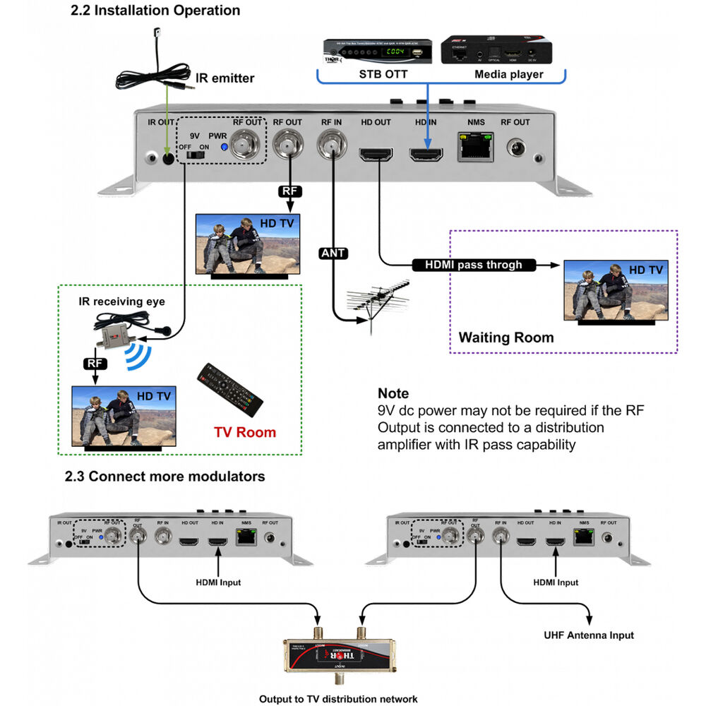 The RF output allows you to connect as many televisions as necessary to your application when using the modulator with an existing coax network. An RF input enables the connection of an antenna and then adding any HDMI source into the ATSC channel lineup. The unit supports all major RF modulation standards.