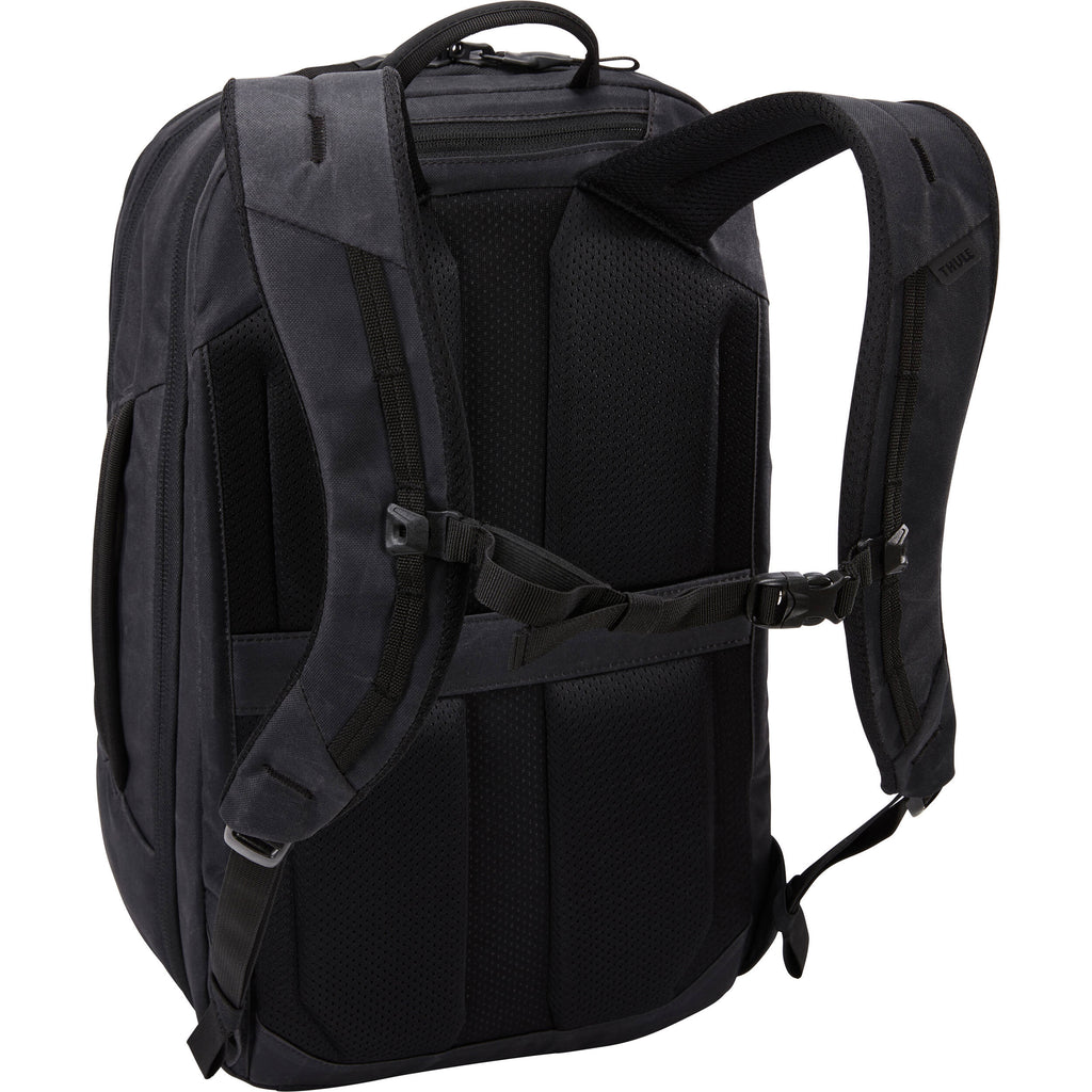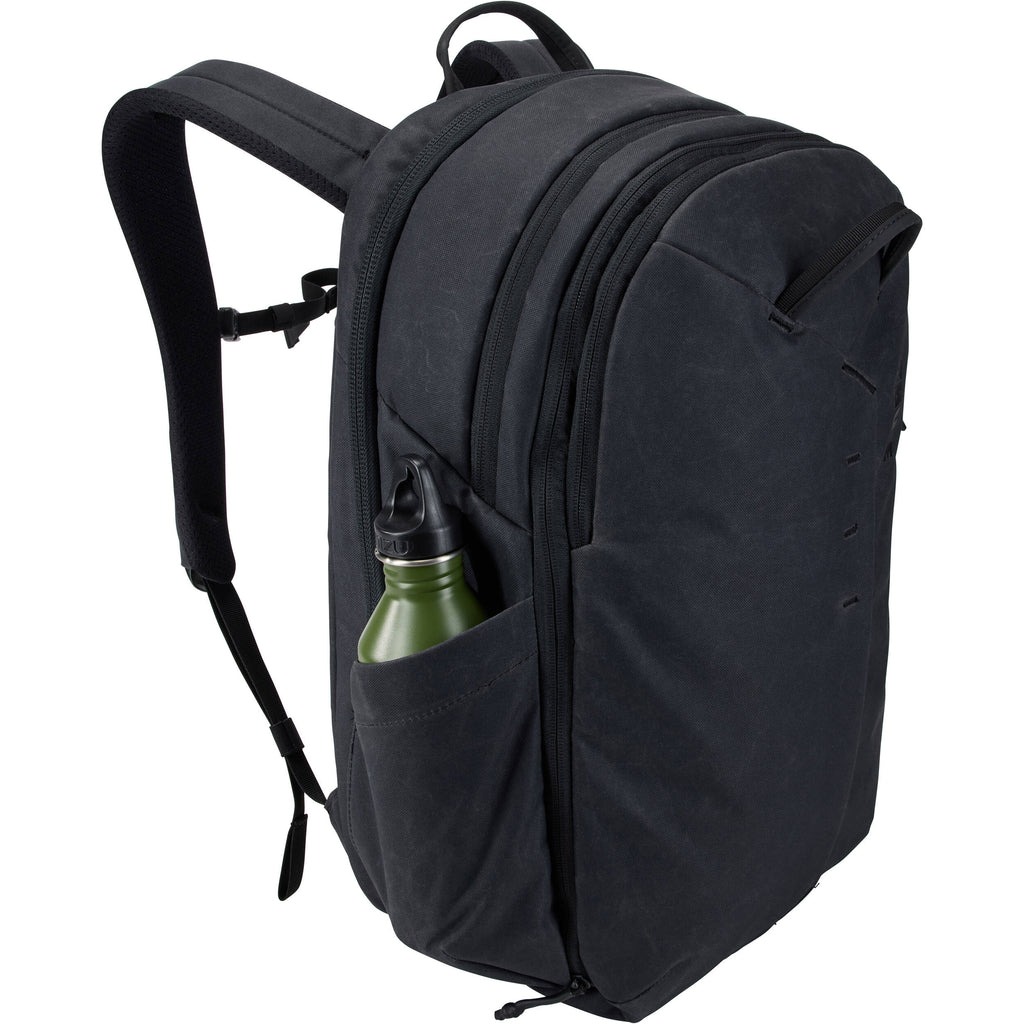 The black Aion 28L Travel Backpack expands from a 28L day pack to a 32L travel backpack for 15% more packable space. Furthermore, this bluesign-certified bag is made from durable recycled materials. A rugged and durable waxed canvas exterior fabric develops even more character as it ages and has a water-resistant finish that is free from toxic PFCs. The bag's back panel fully unzips and opens like a suitcase for easier packing. Inside, a stowable divider with TPU lining helps to organize your gear while keeping moisture, odor, or dirt from spreading to contents in the rest of the bag. Dedicated areas provide room for electronics storage and a water bottle pocket. The Thule Aion Sling, available separately, can be used with this backpack as a hip belt to bear extra weight and provide quick access to vital items.